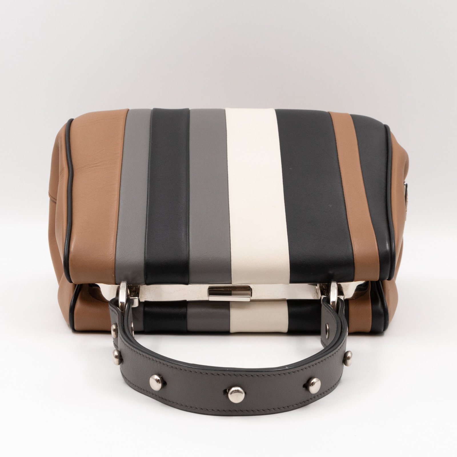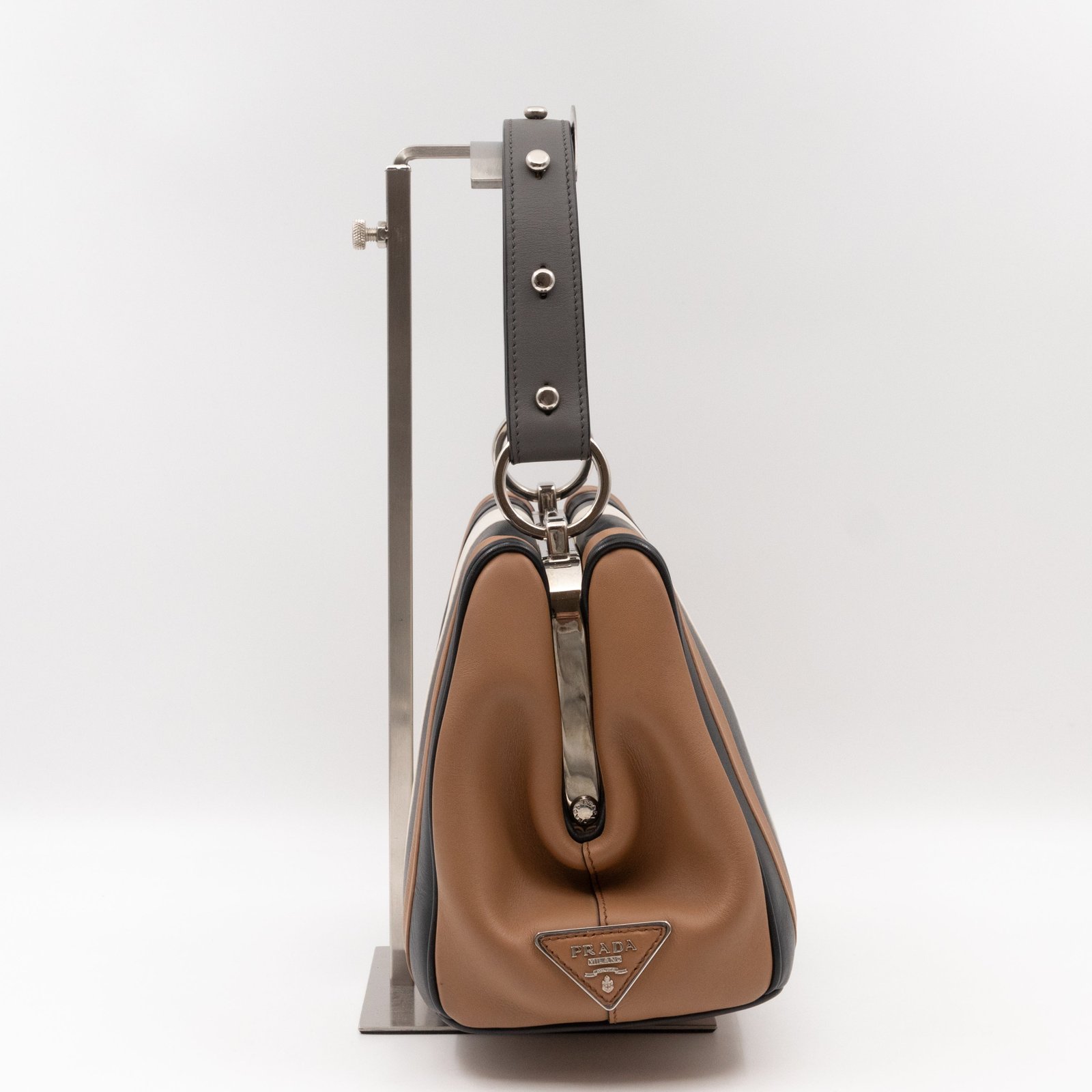 This is a pretty Prada Baiadera frame handbag. Very convenient shoulder bag in a brown leather, combined with silver-tone hardware. The neutral palette of the color bock exterior make the bag trendy. This fun bag features a frame top with push closures, inside a slim pocket. Great choice for daily use.