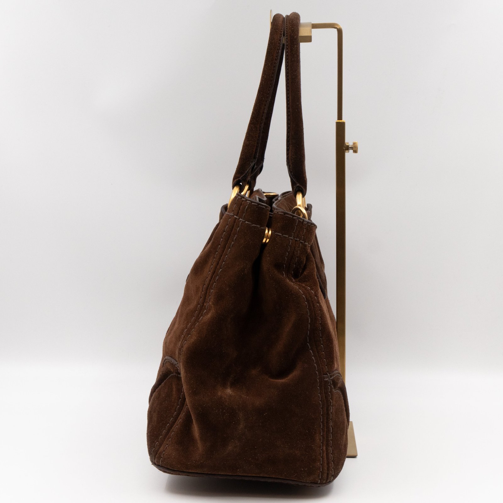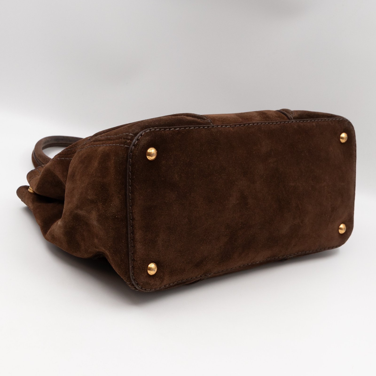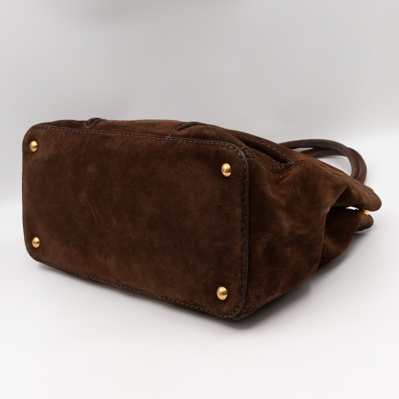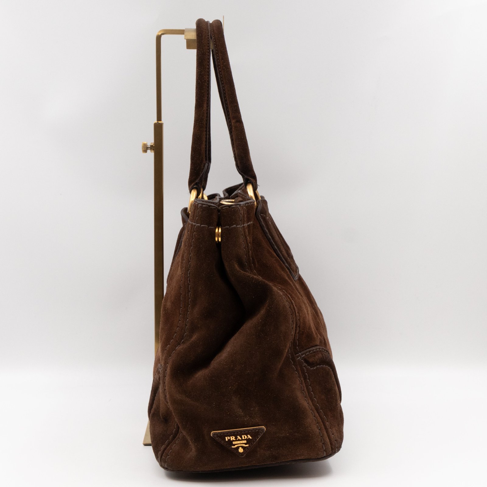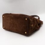 This is a Prada Bowling hand bag. This soft hand bag is made with brown suede leather and gold-tone hardware. The bag features a side Prada triangle logo and dual rolled leather handles. This top opens with a magnet to a compartment one zipper pocket and two small slim pocket. Has a adjustable shoulder strap for easy carrying. Easy to use everyday, with documents, iPad, and all daily items.
