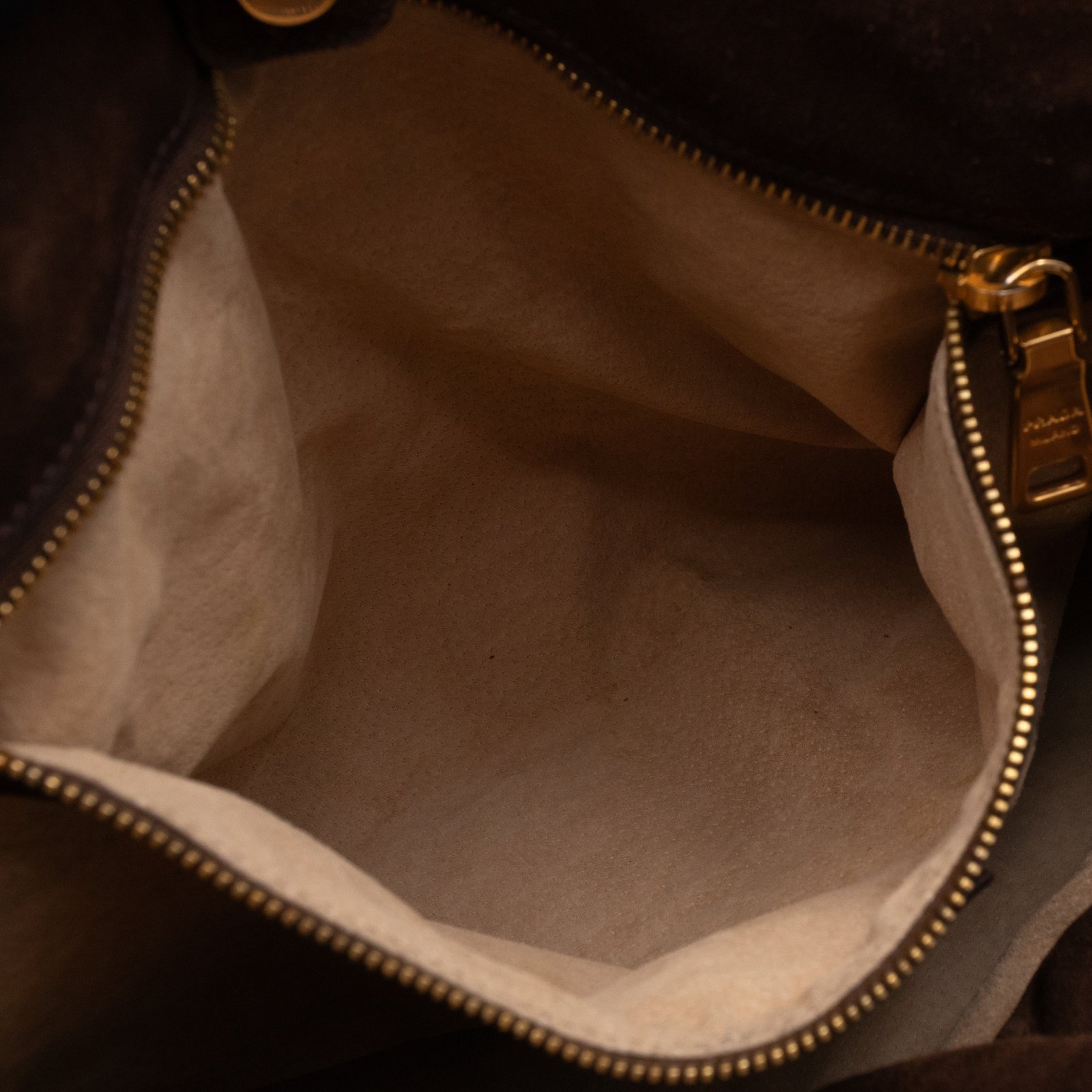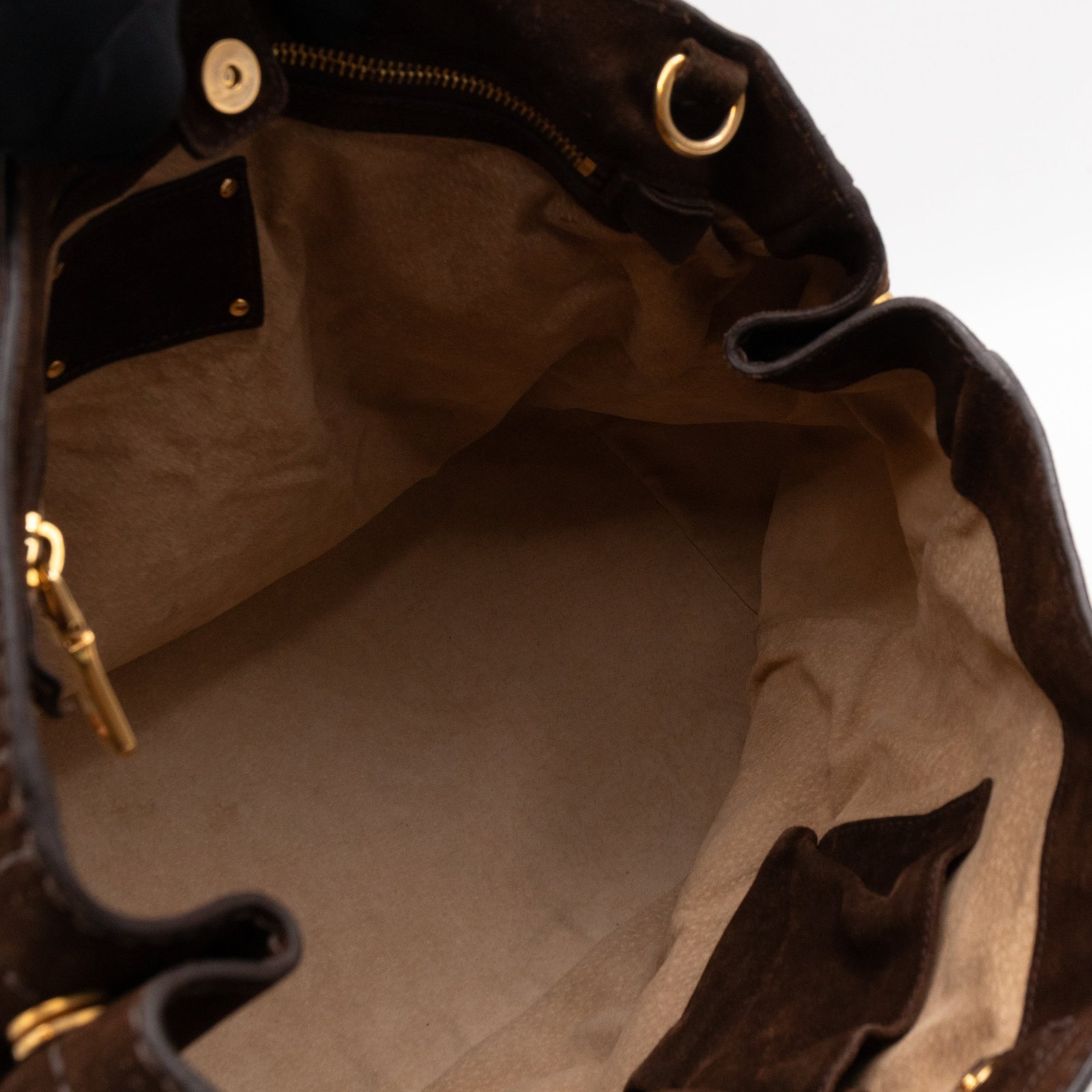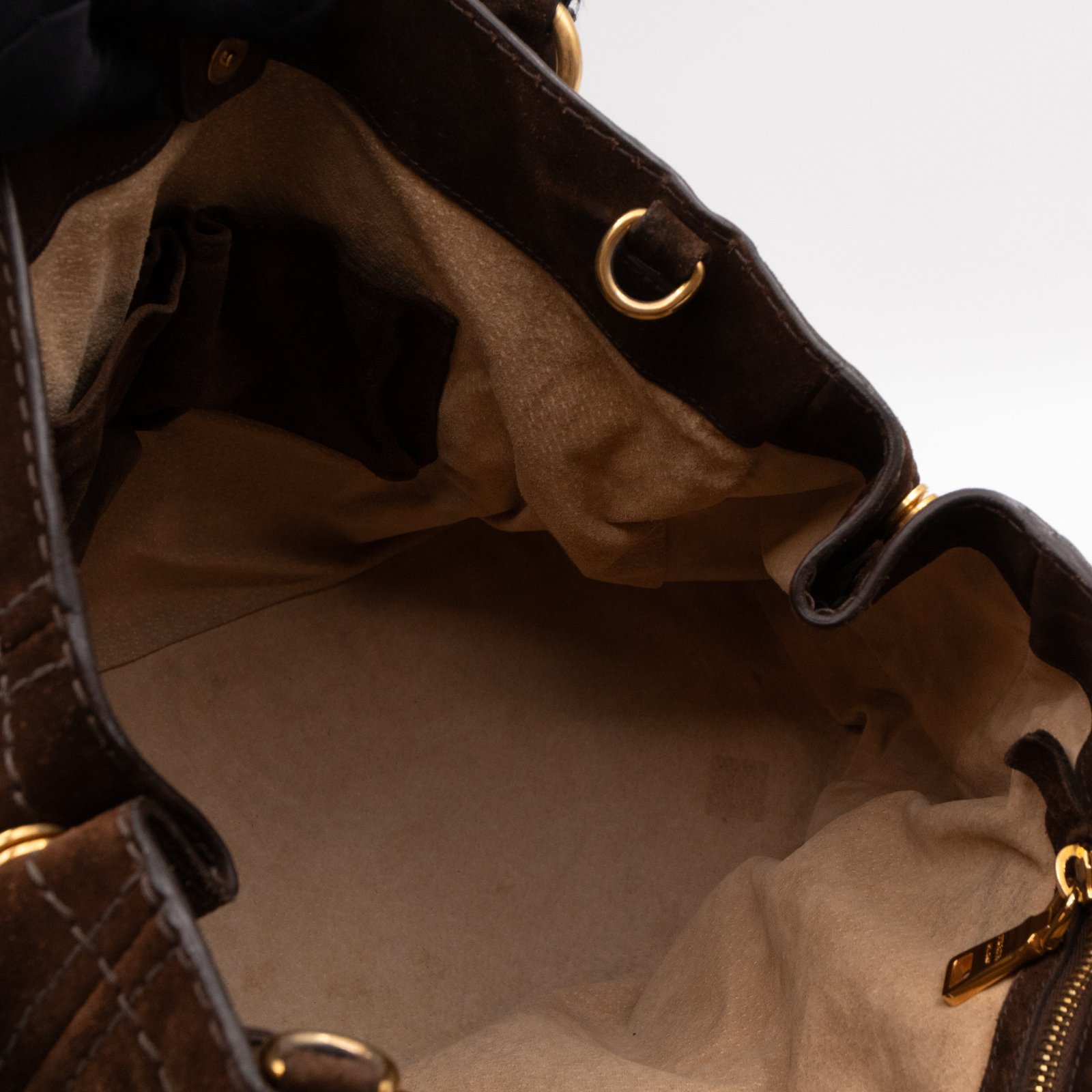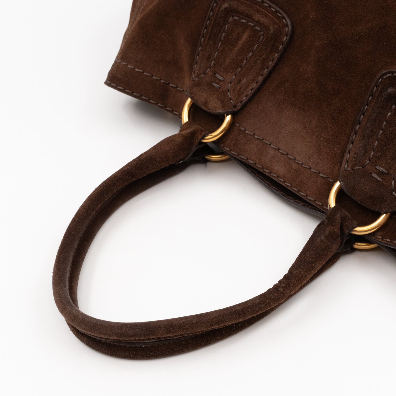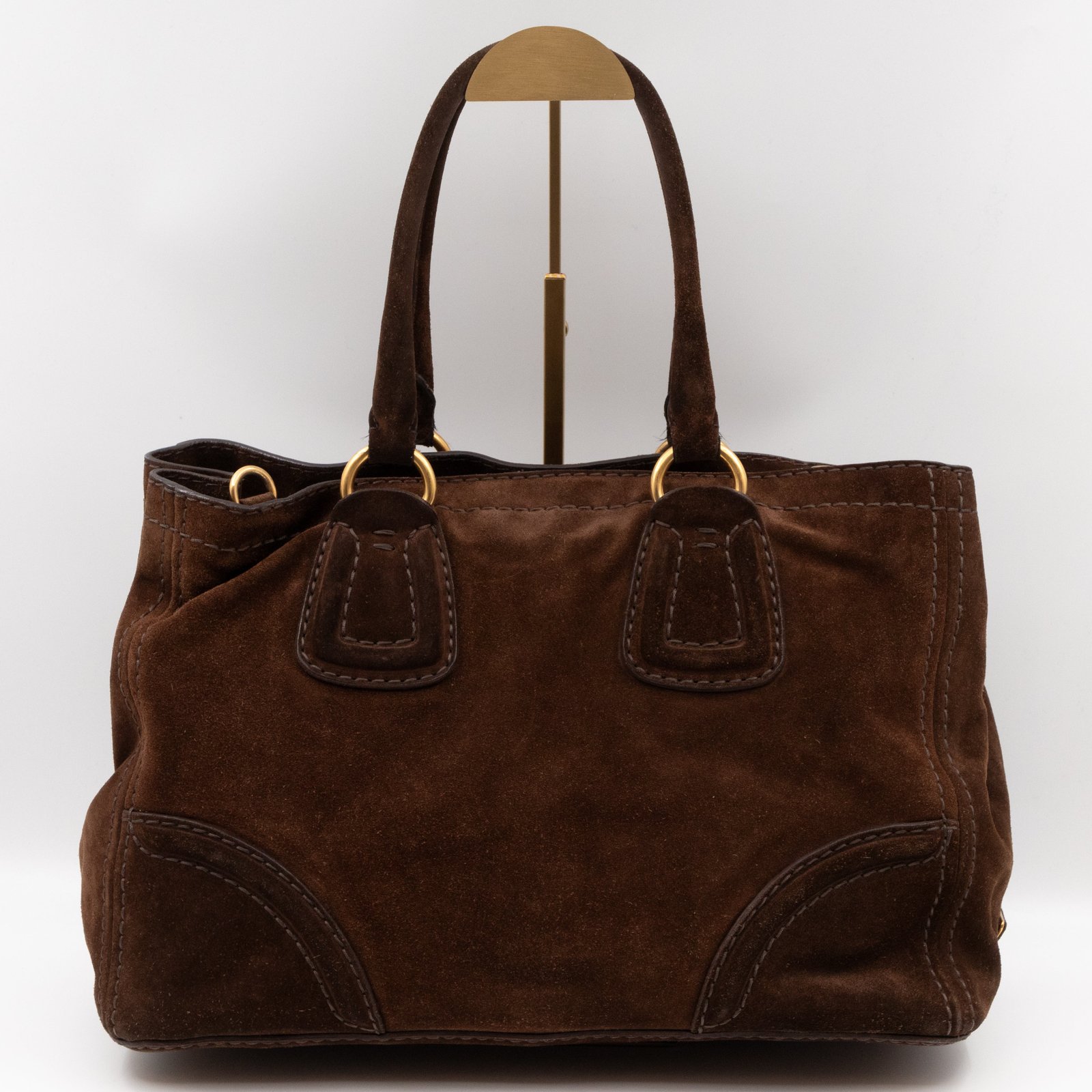This is a Prada Bowling hand bag. This soft hand bag is made with brown suede leather and gold-tone hardware. The bag features a side Prada triangle logo and dual rolled leather handles. This top opens with a magnet to a compartment one zipper pocket and two small slim pocket. Has a adjustable shoulder strap for easy carrying. Easy to use everyday, with documents, iPad, and all daily items.