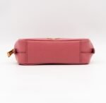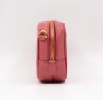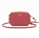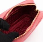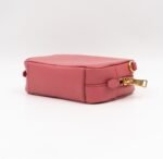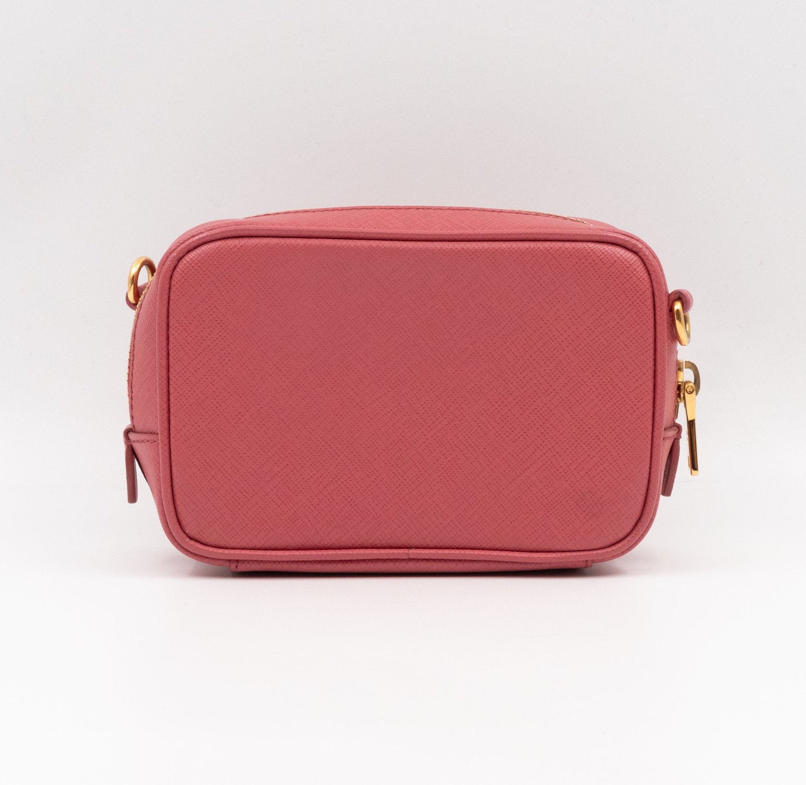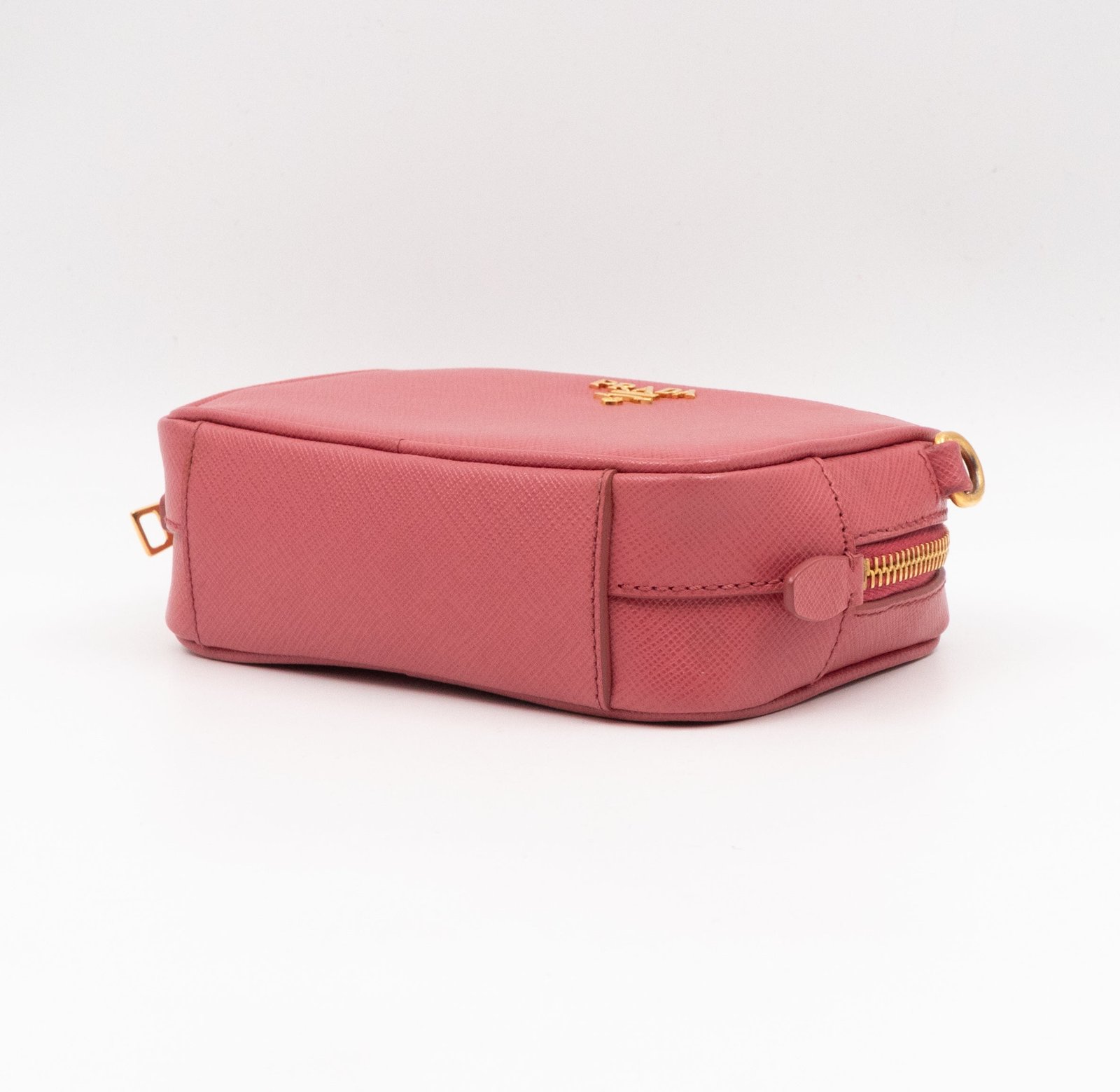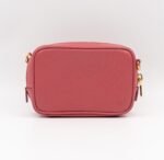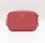 A Prada crossbody camera bag in classic pink saffiano leather. This small sized bag has a removable shoulder strap for comfortable crossbody use. Great for daily use for your phone, cards, and keys. Inside has two slim pockets. On front a Prada logo in gold color. Inside fits a phone with max length is 14 cm.