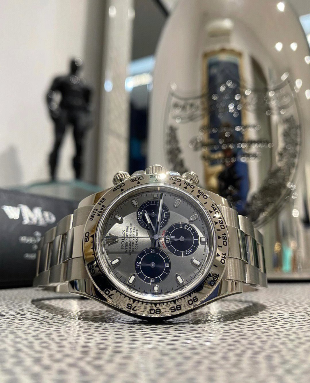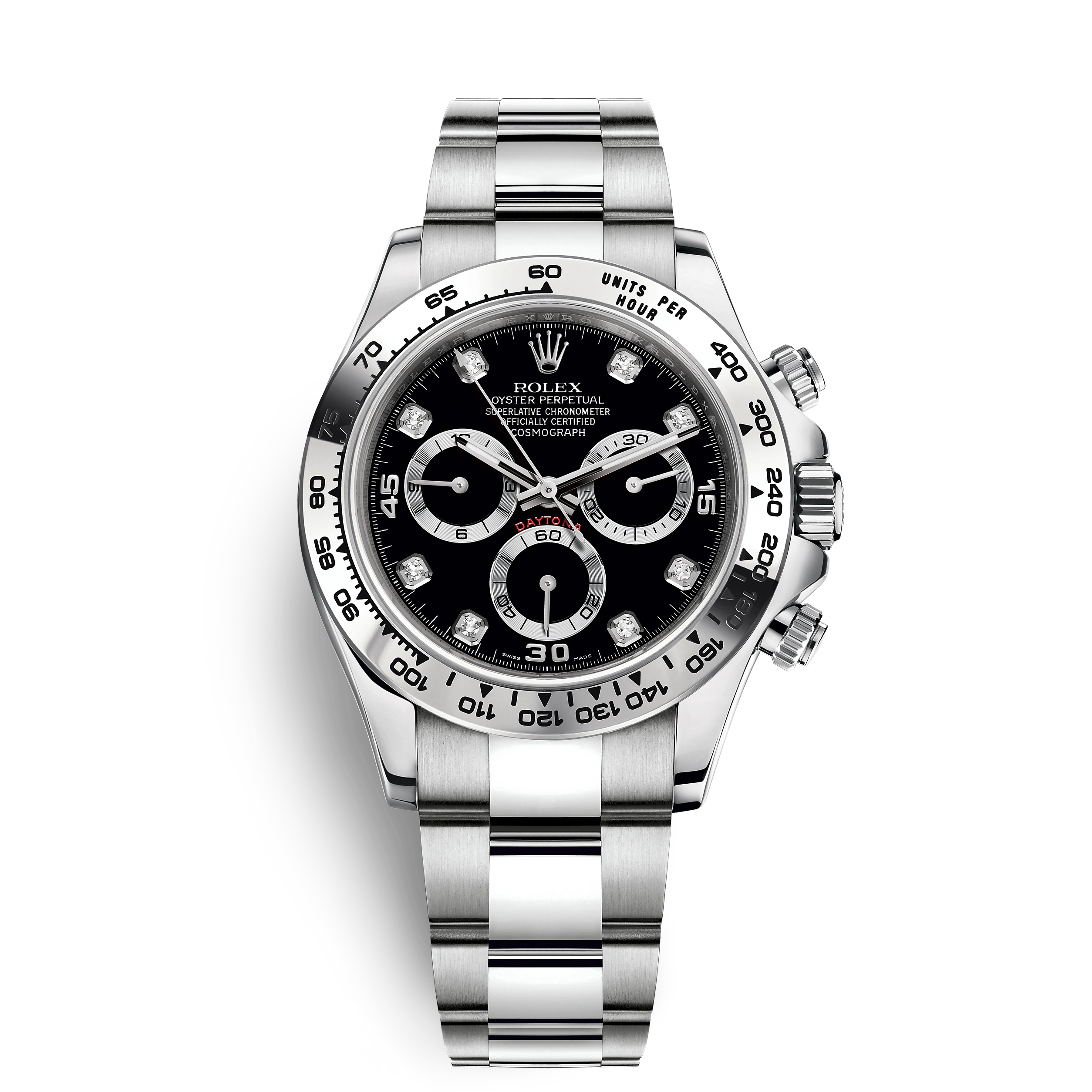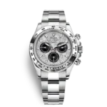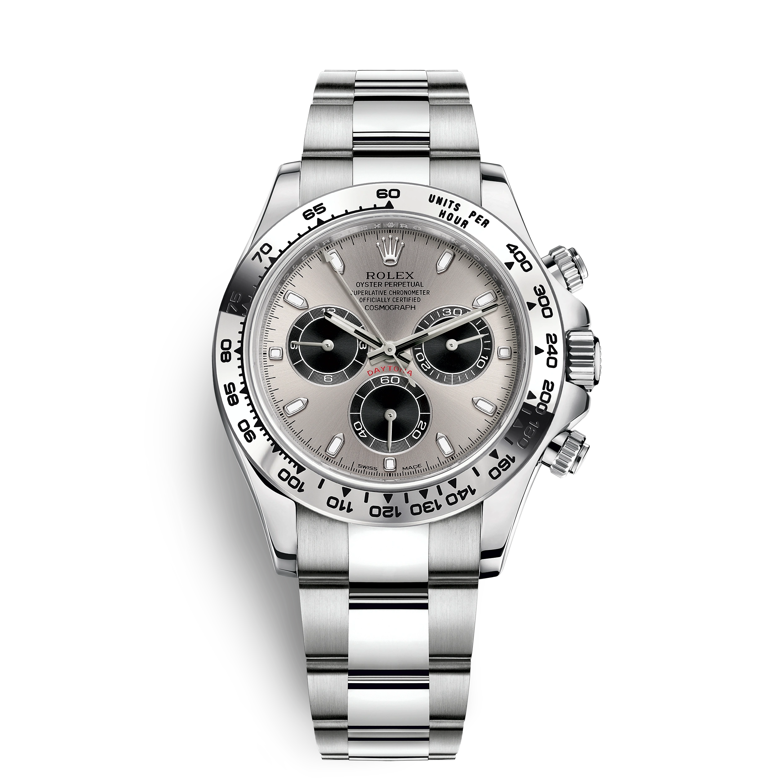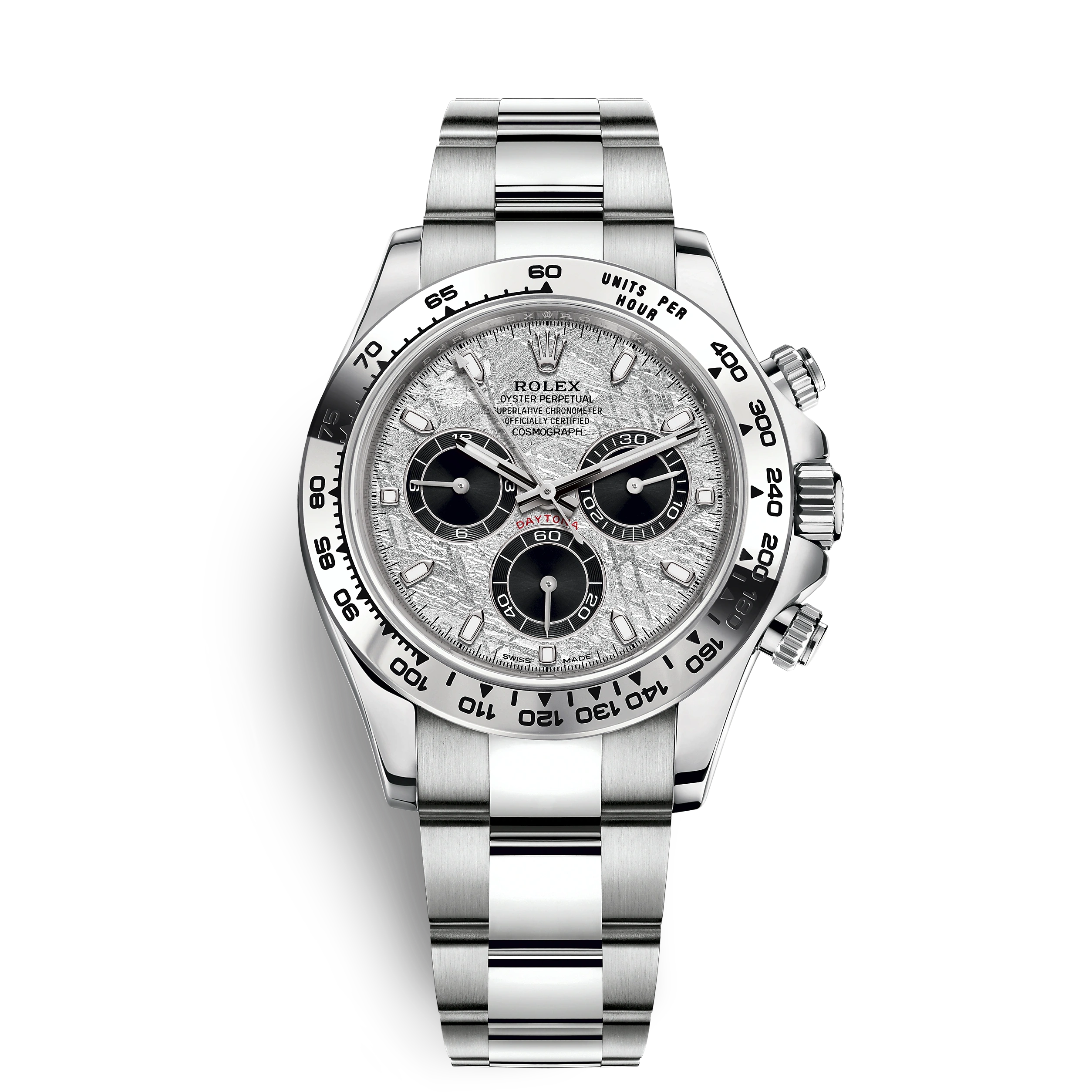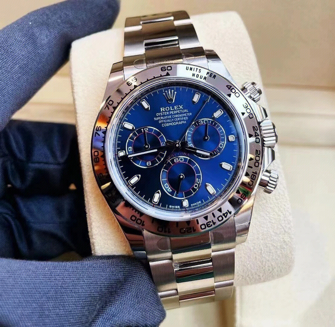 This Oyster Perpetual Cosmograph Daytona in 18 ct white gold, with a bright blue dial and an Oyster bracelet, features an 18 ct white gold bezel with engraved tachymetric scale.