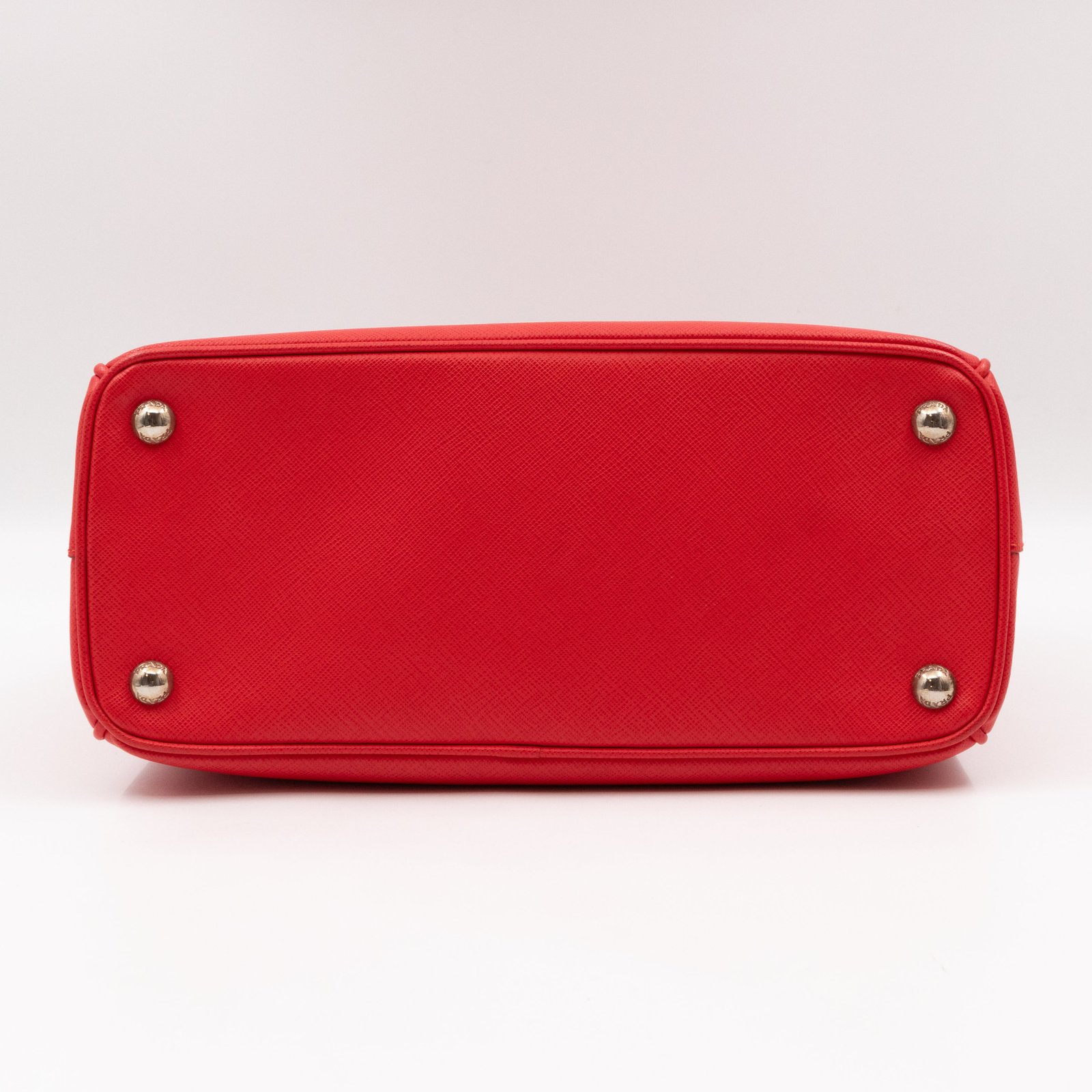 A Prada Galleria Medium Double Zip bag in durable Saffiano leather. Very convenient double zipper bag in nice lacca red color, combined with silver-tone hardware. This medium edition size fits your phone, wallet, documents and so on, even a smaller laptop or iPad fits nicely. Great choice for daily use. Each side has zipper pockets, the middle compartment expands to a spacious size. Current retail price €3700.