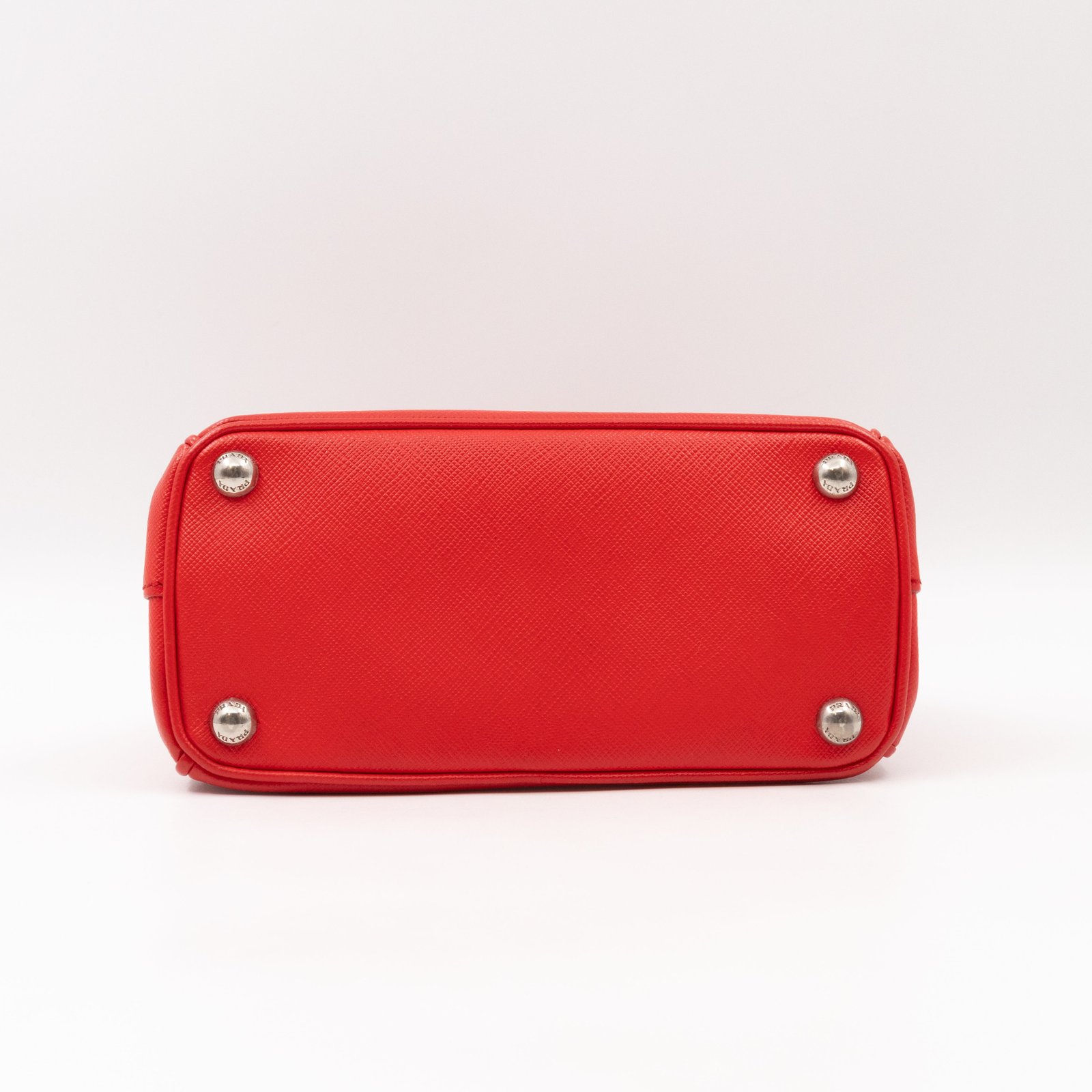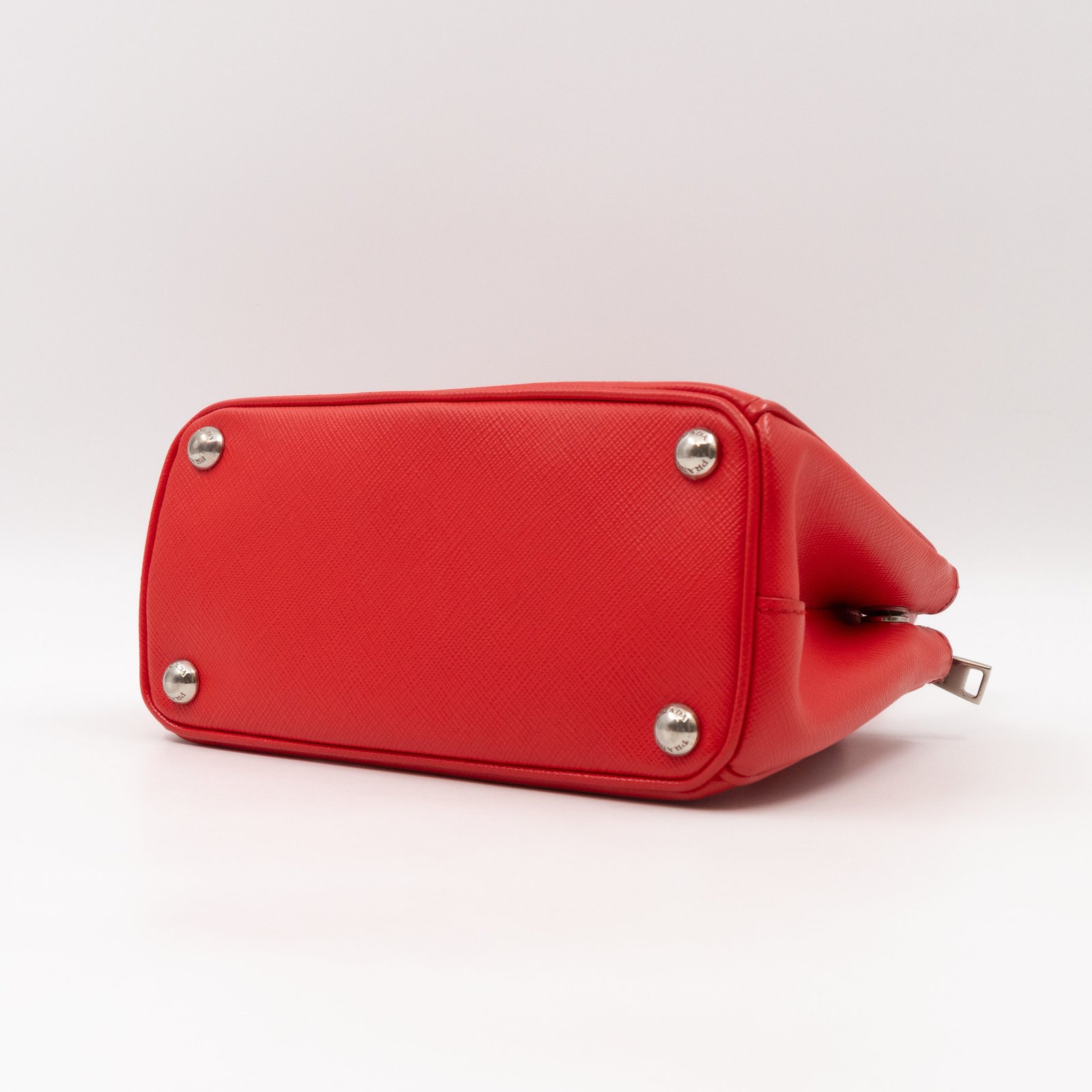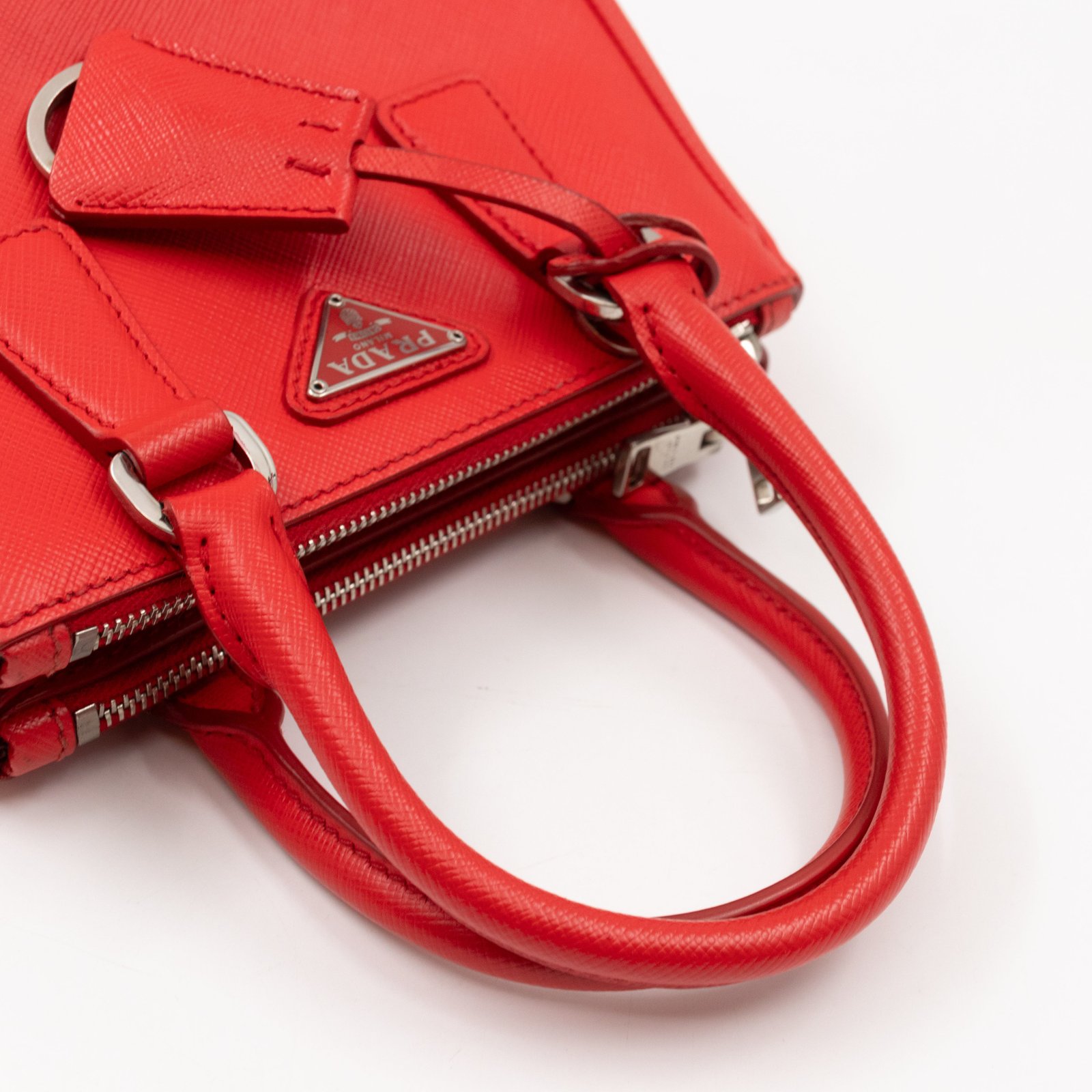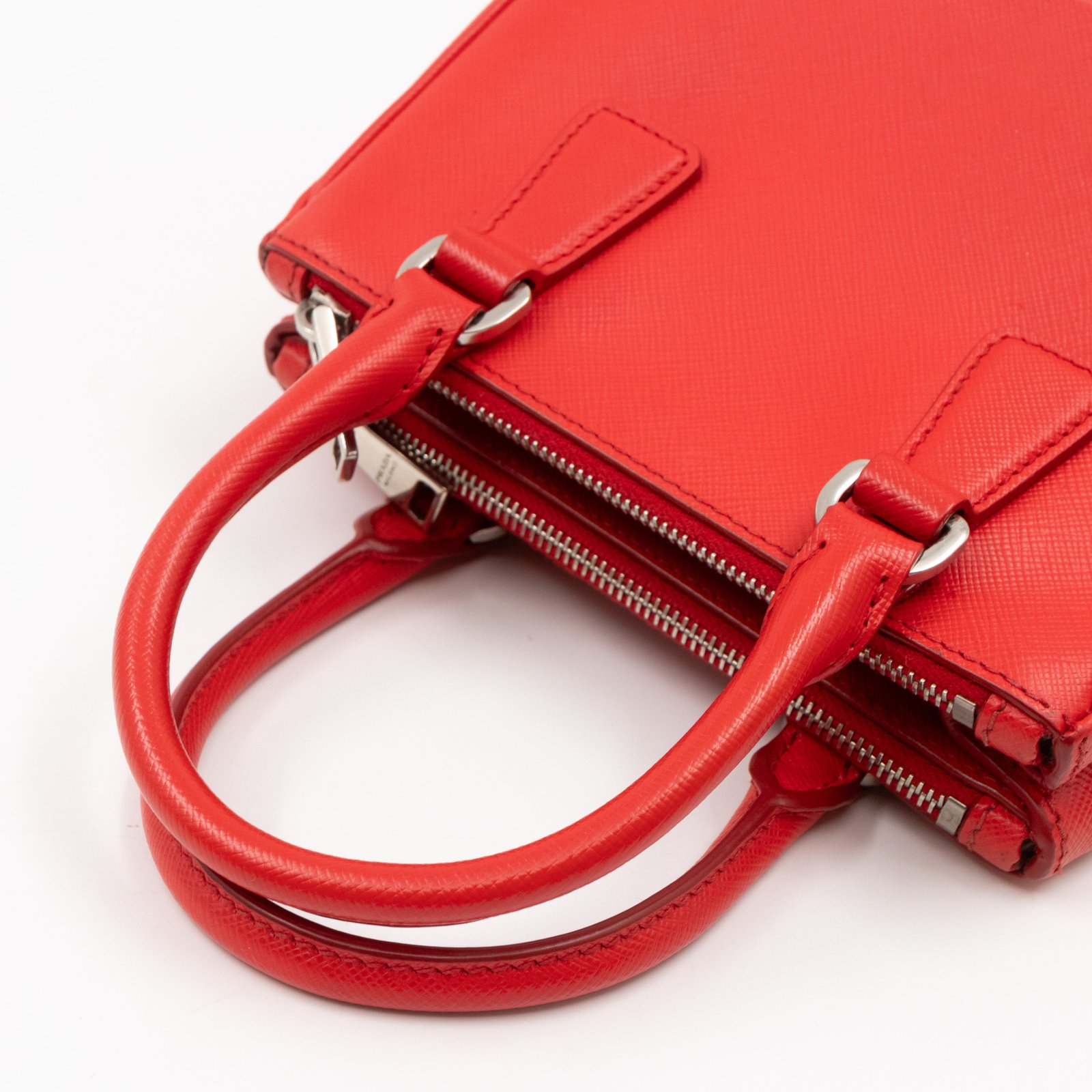 A cute micro sized edition Prada Galleria Micro Double Zip bag. Made with Saffiano leather in red, combined with silver-tone hardware. This miniature Galleria fits your phone, and wallet, with other small items. Each side has zipper pockets, the middle compartment expands to a more spacious size. Current retail price over €3200.