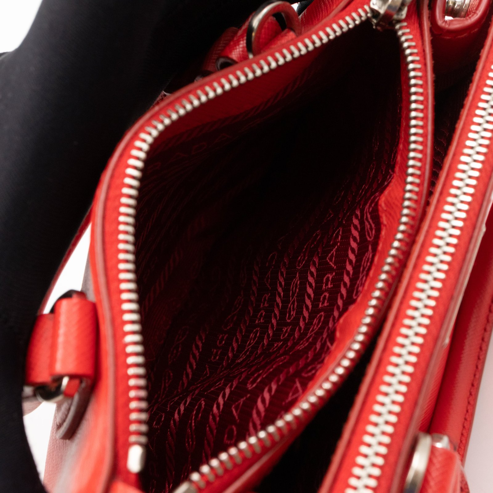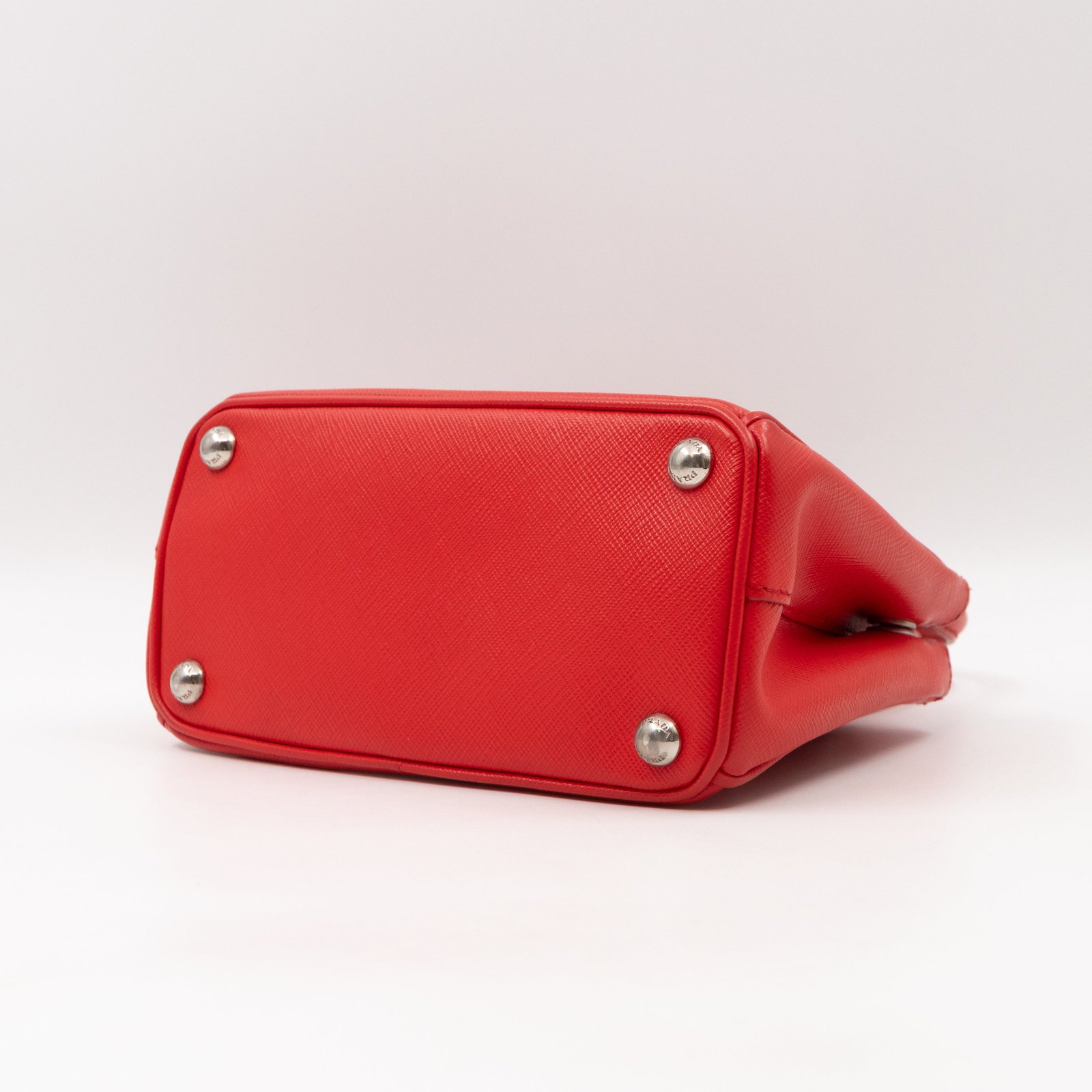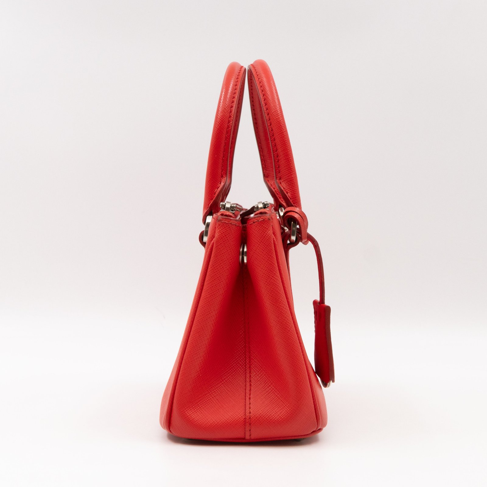 A cute micro sized edition Prada Galleria Micro Double Zip bag. Made with Saffiano leather in red, combined with silver-tone hardware. This miniature Galleria fits your phone, and wallet, with other small items. Each side has zipper pockets, the middle compartment expands to a more spacious size. Current retail price over €3200.