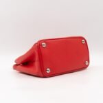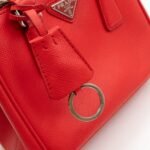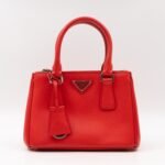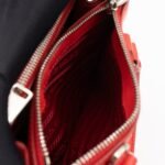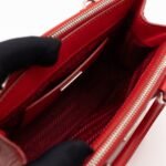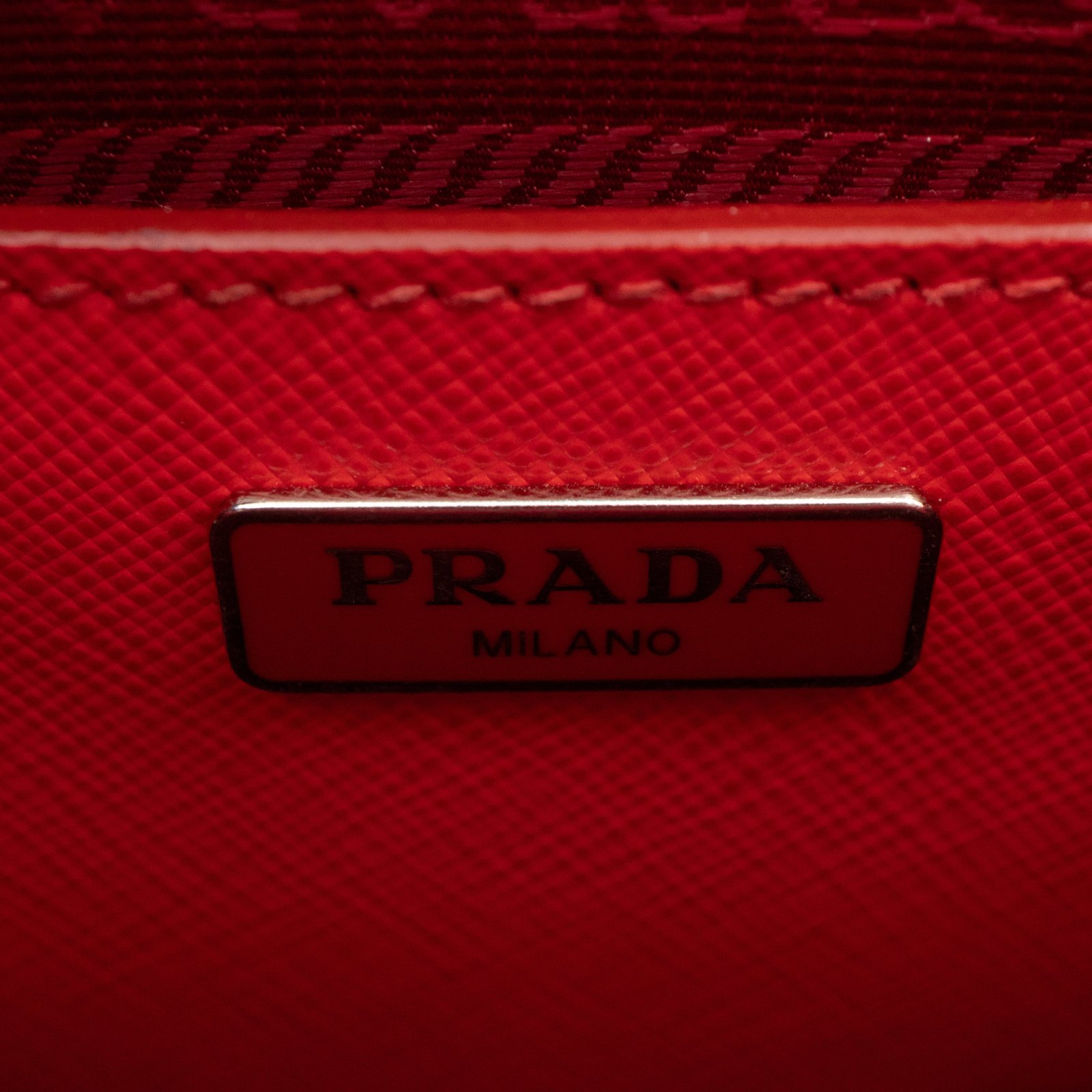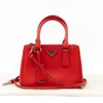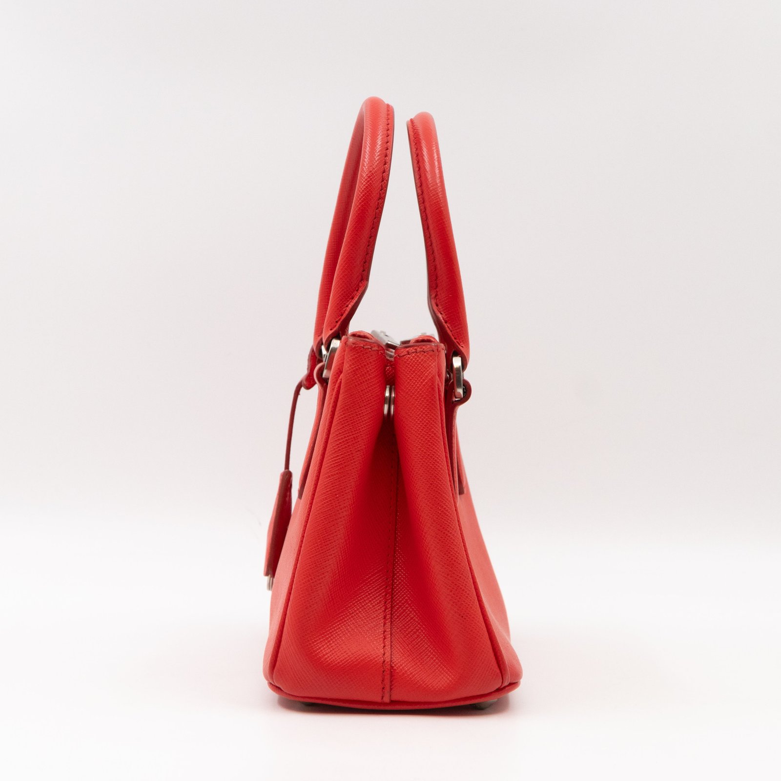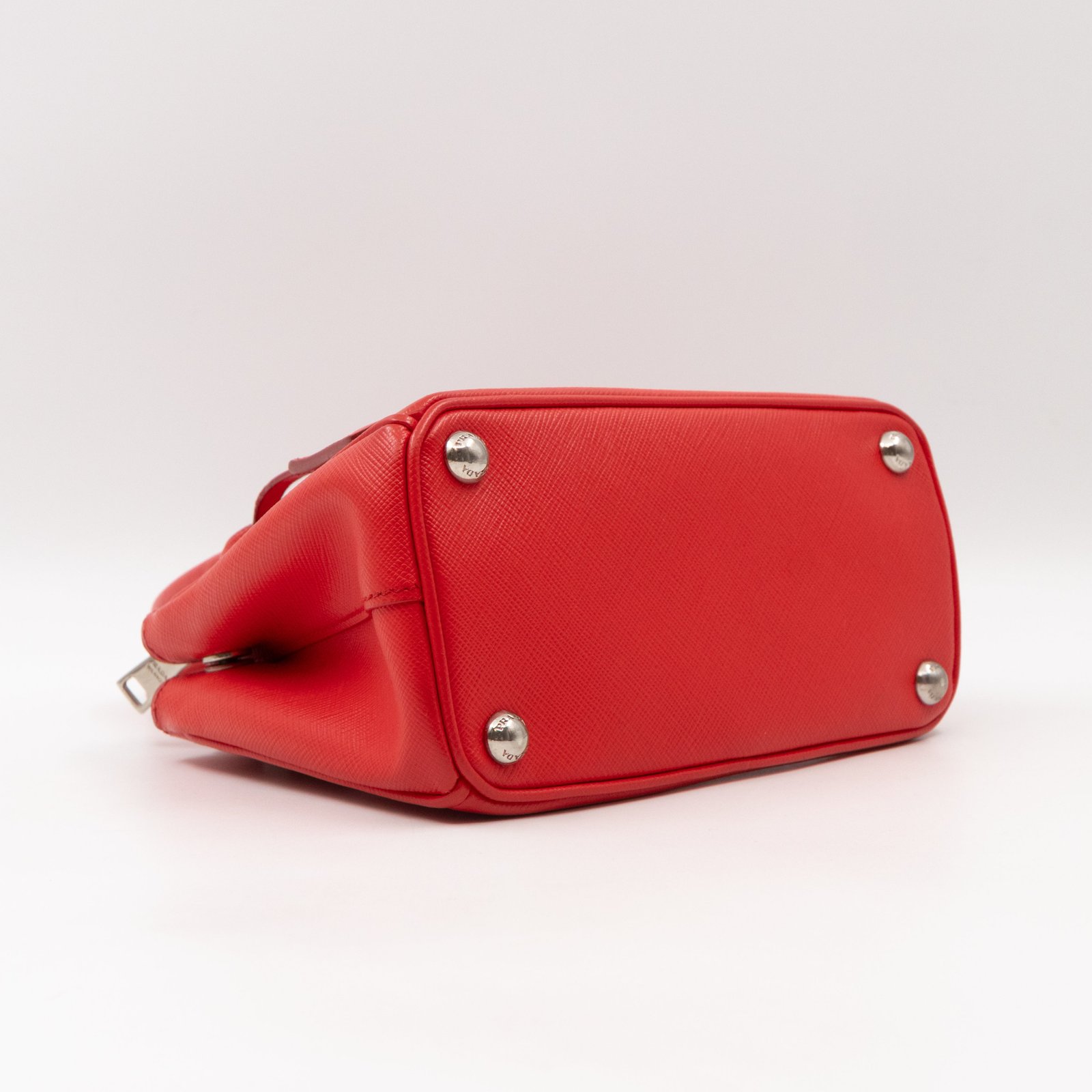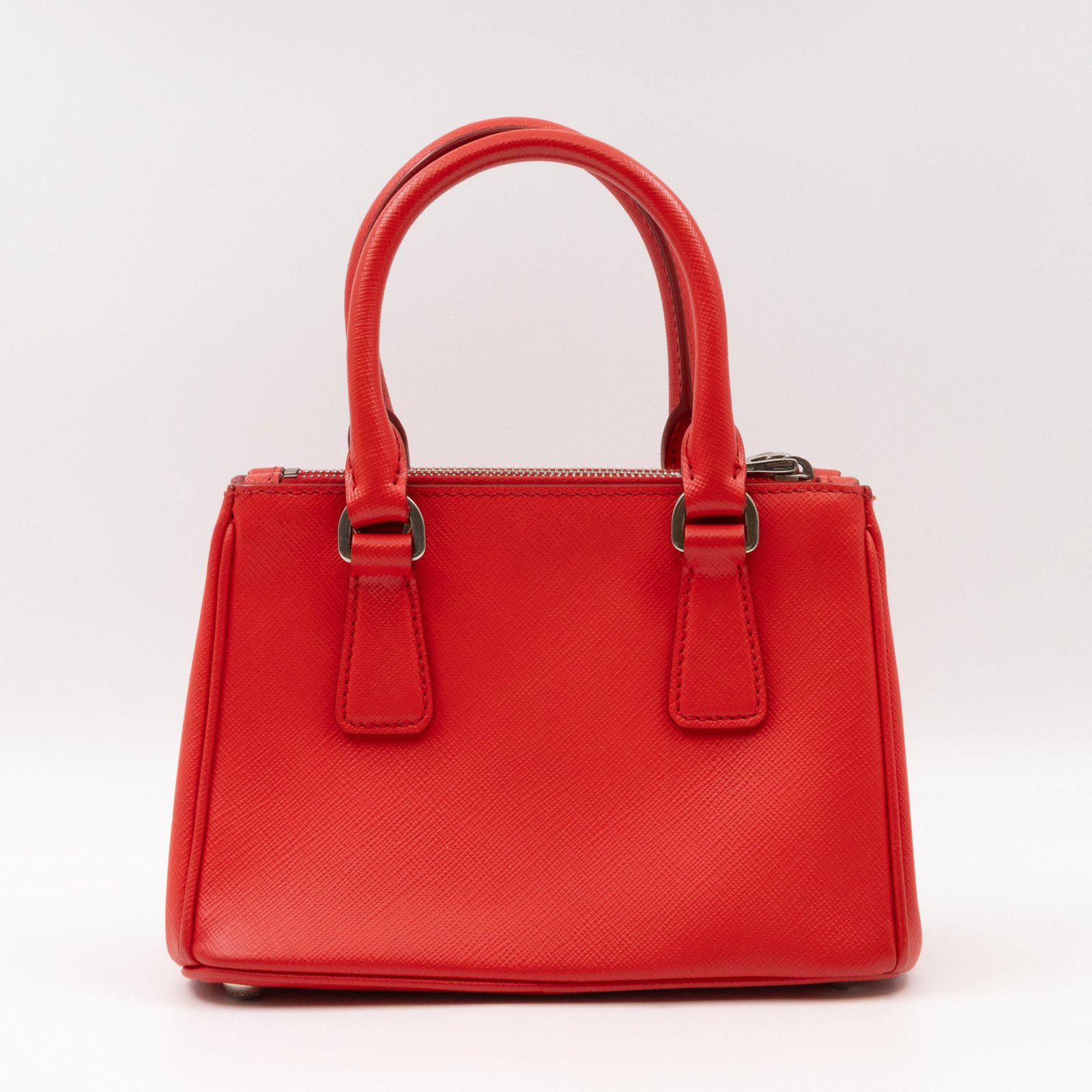A cute micro sized edition Prada Galleria Micro Double Zip bag. Made with Saffiano leather in red, combined with silver-tone hardware. This miniature Galleria fits your phone, and wallet, with other small items. Each side has zipper pockets, the middle compartment expands to a more spacious size. Current retail price over €3200.