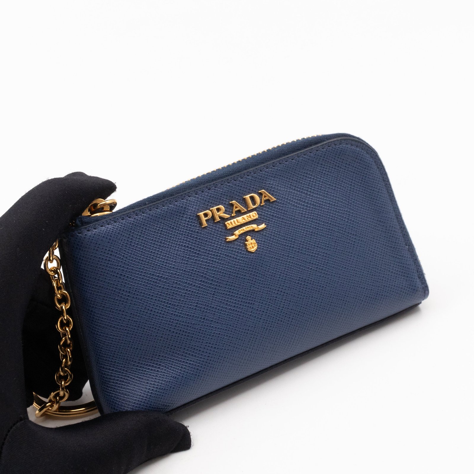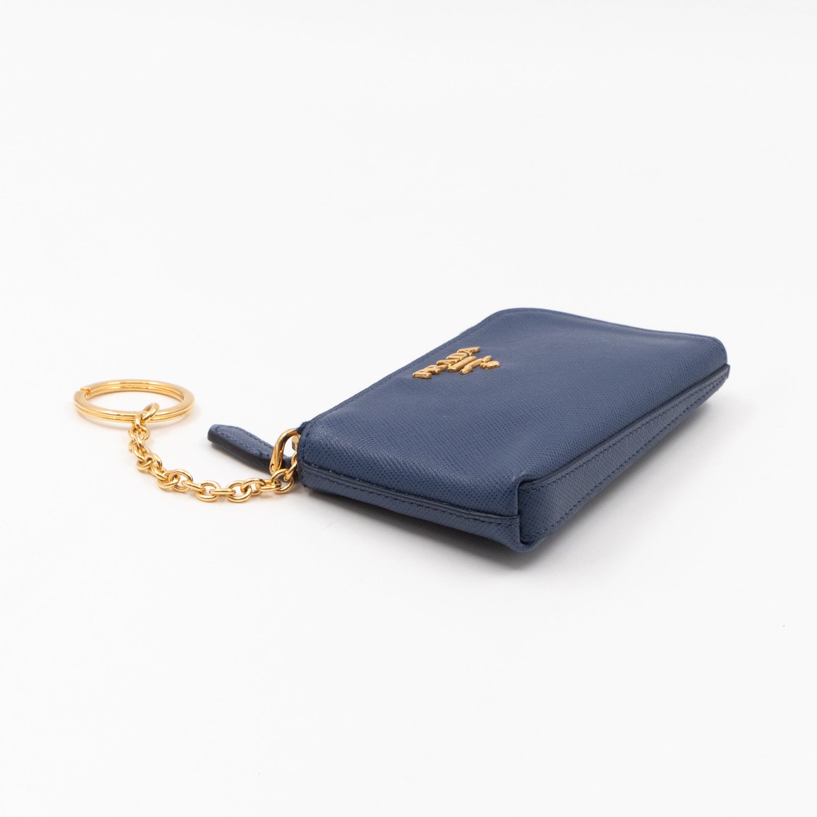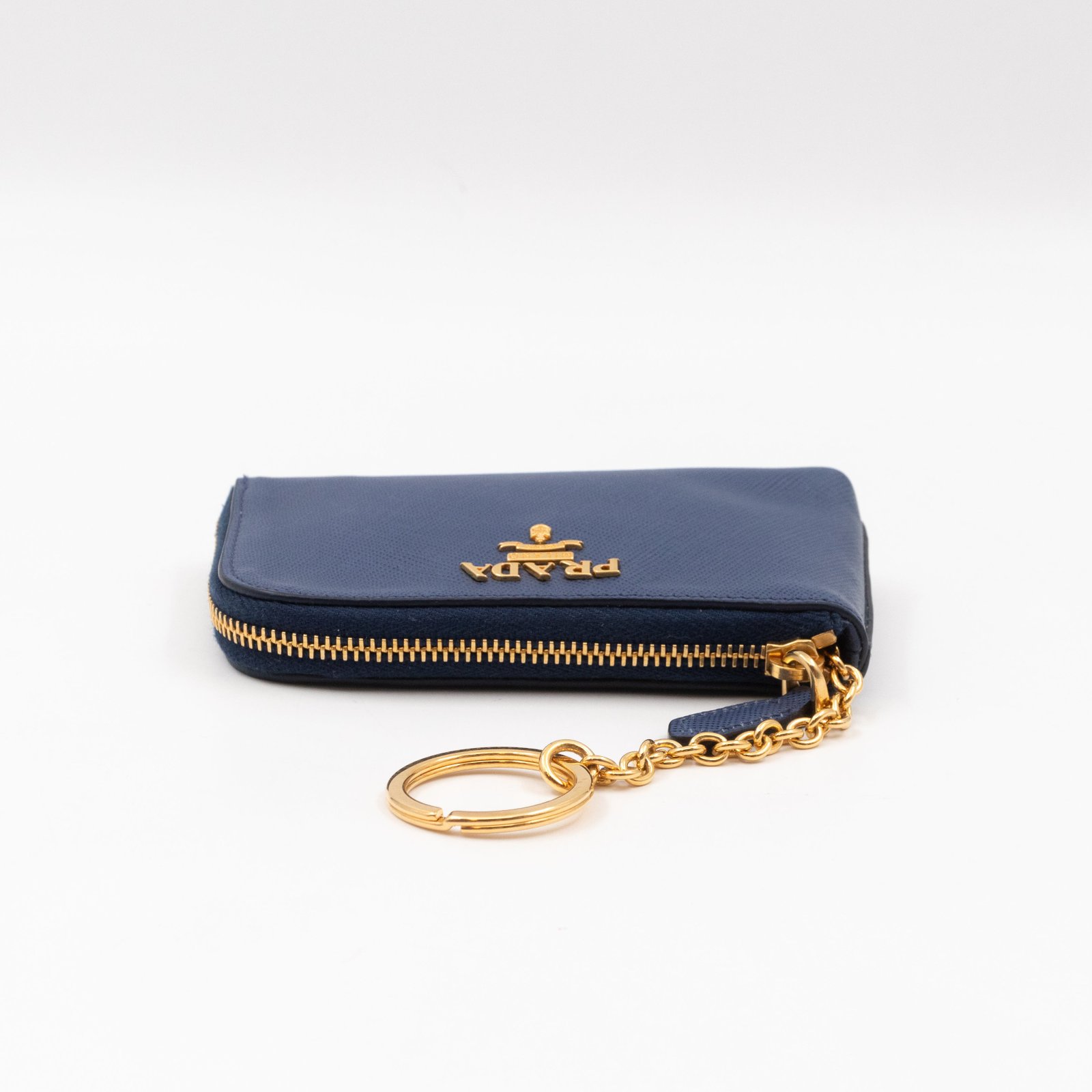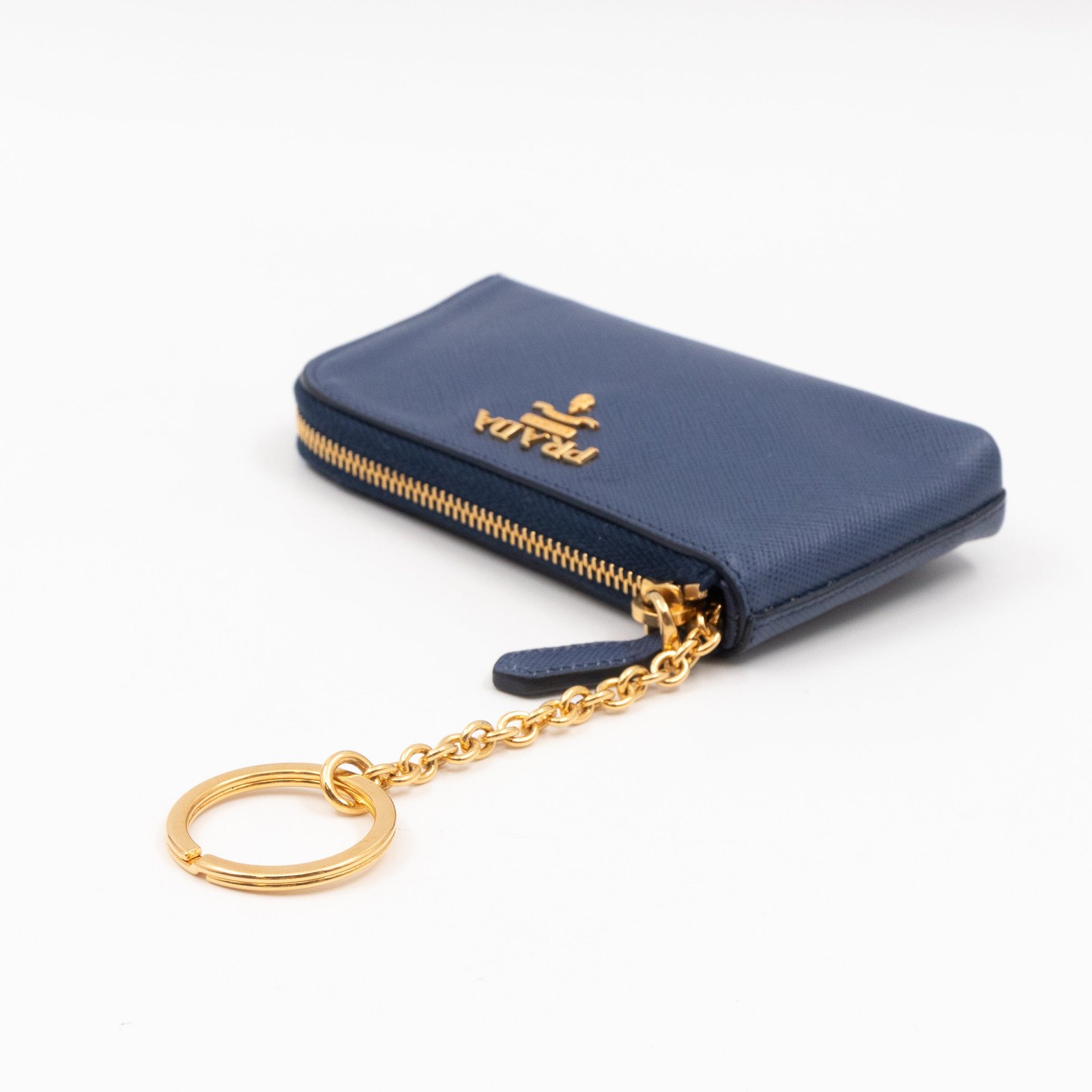 A practical mini Key Pouch from Prada. This everyday accessory is made with blue saffiano leather, it has zipper closure and a key ring on chain inside. Attach it your bag or keep it in your pocket. It fits keys, coins and even bank cards.