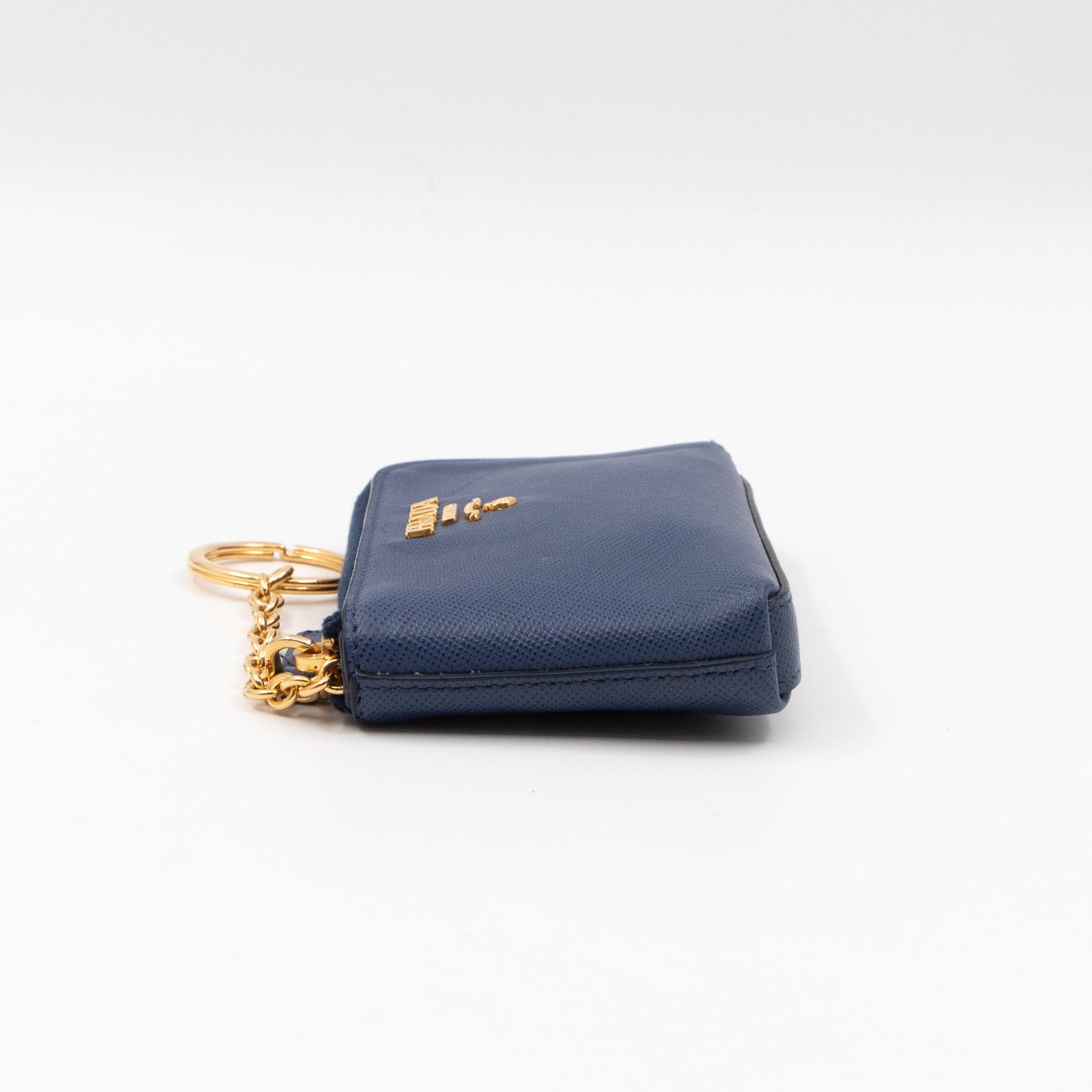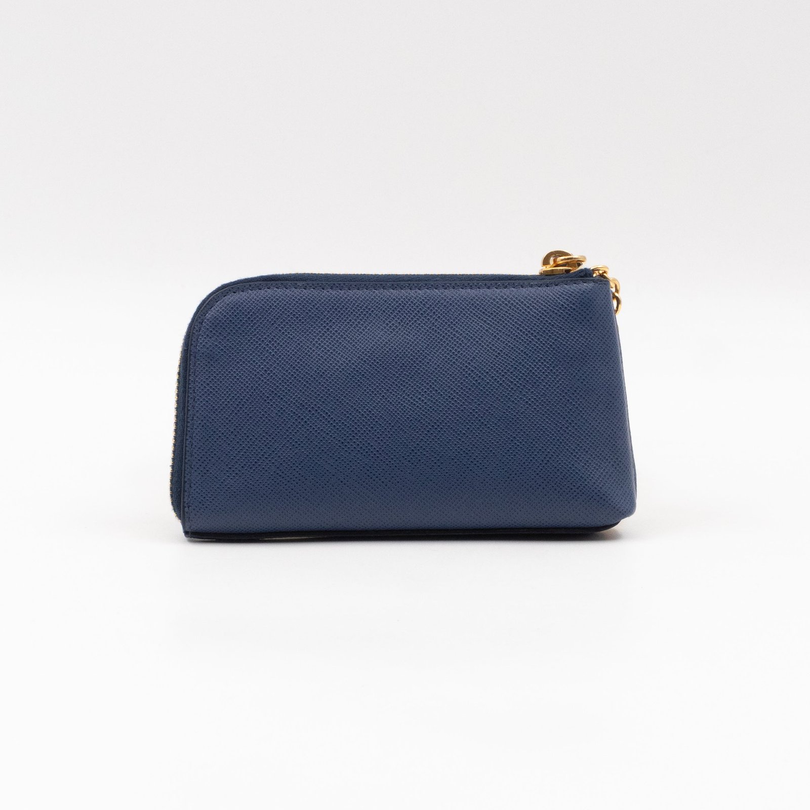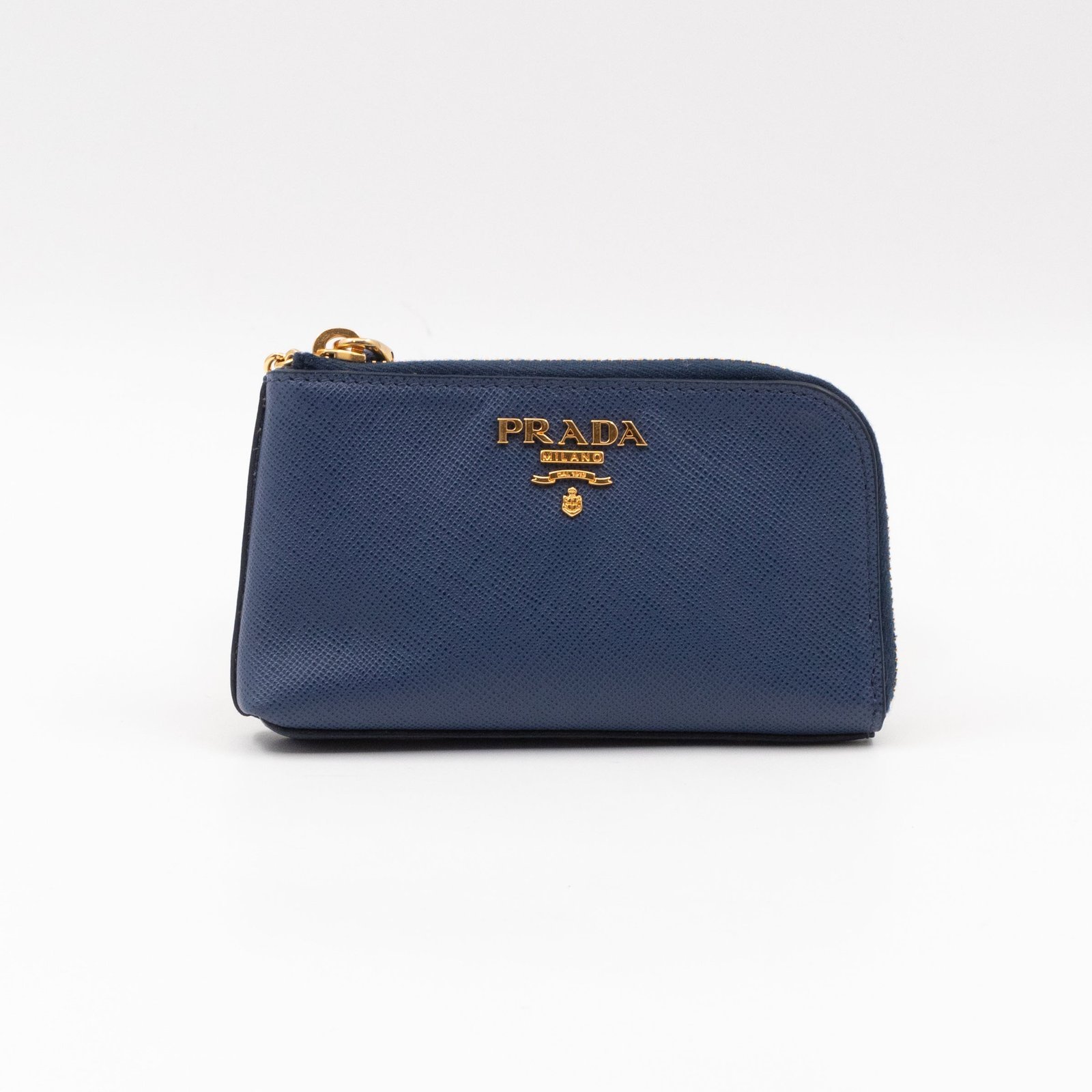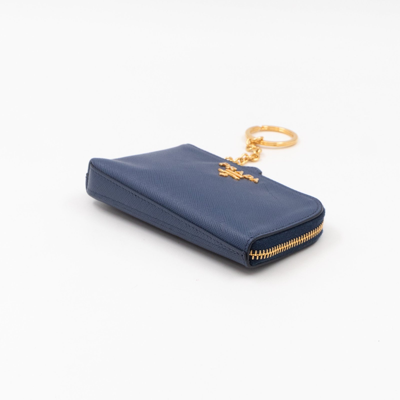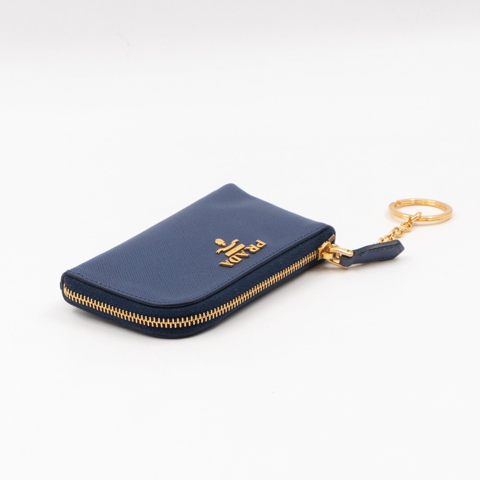 A practical mini Key Pouch from Prada. This everyday accessory is made with blue saffiano leather, it has zipper closure and a key ring on chain inside. Attach it your bag or keep it in your pocket. It fits keys, coins and even bank cards.
