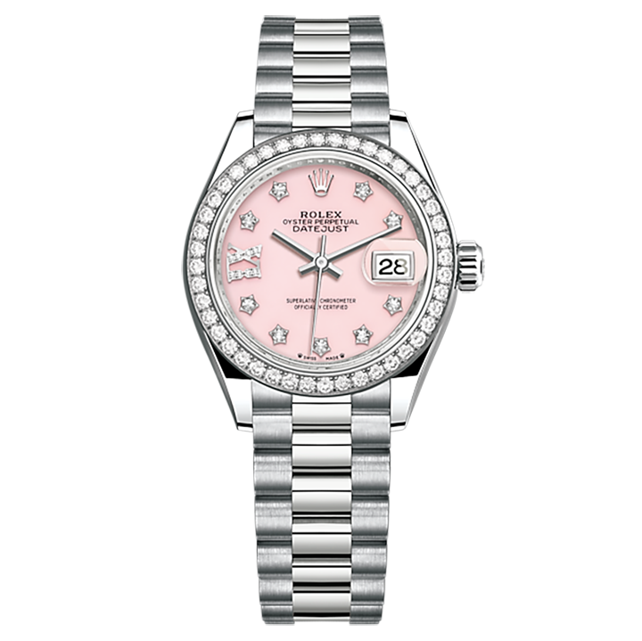 The light reflections on the case sides and lugs highlight the elegant profile of the 28 mm Oyster case, which is fitted with a diamond-set bezel. Rolex’s classic feminine watch, the Lady-Datejust is in the lineage of the Datejust, the emblematic model that has been a byword for style and accurate timekeeping.