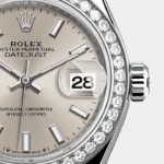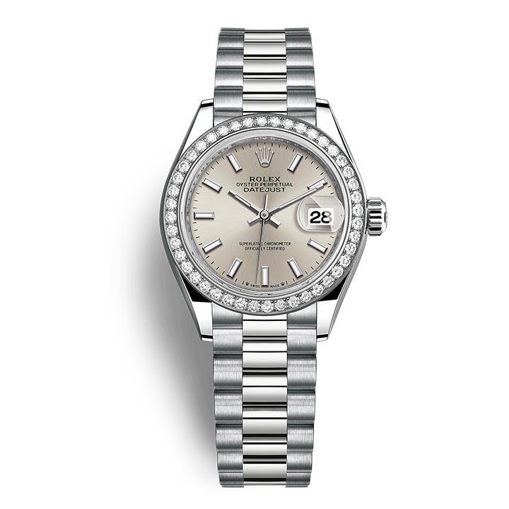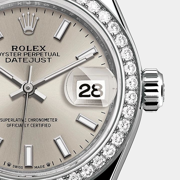 The light reflections on the case sides and lugs highlight the elegant profile of the 28 mm Oyster case, which is fitted with a diamond-set bezel. Rolex’s classic feminine watch, the Lady-Datejust is in the lineage of the Datejust, the emblematic model that has been a byword for style and accurate timekeeping.