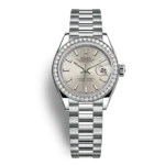 THIS OYSTER PERPETUAL LADY-DATEJUST IN 18 CT WHITE GOLD FEATURES A SILVER DIAL AND A PRESIDENT BRACELET.