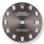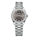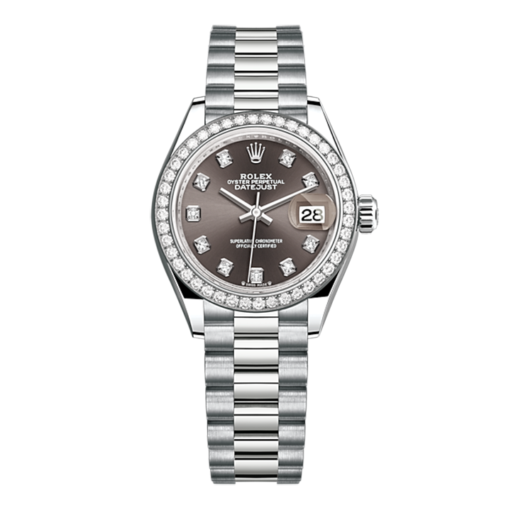 THIS OYSTER PERPETUAL LADY-DATEJUST IN 18 CT WHITE GOLD FEATURES A DARK GREY, DIAMOND-SET DIAL AND A PRESIDENT BRACELET.