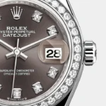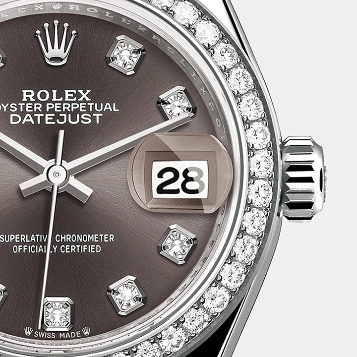 The light reflections on the case sides and lugs highlight the elegant profile of the 28 mm Oyster case, which is fitted with a diamond-set bezel. Rolex’s classic feminine watch, the Lady-Datejust is in the lineage of the Datejust, the emblematic model that has been a byword for style and accurate timekeeping.