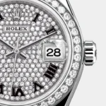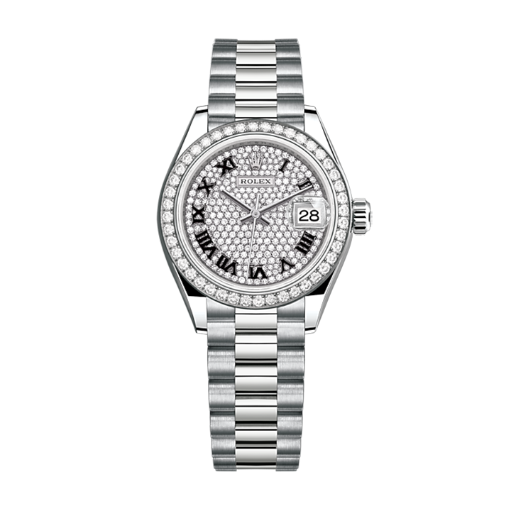 The light reflections on the case sides and lugs highlight the elegant profile of the 28 mm Oyster case, which is fitted with a diamond-set bezel. Rolex’s classic feminine watch, the Lady-Datejust is in the lineage of the Datejust, the emblematic model that has been a byword for style and accurate timekeeping.
