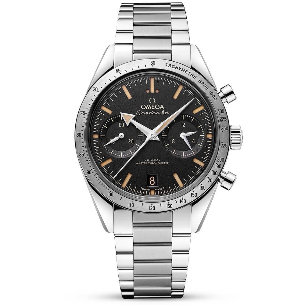 This OMEGA Moonwatch has a white lacquered step dial with blackened hands and hour indexes. Sapphire crystal glass and water resistant up to 50m. Power reserve up to 50 hours. Manual-wind OMEGA 3861 movement. Stainless steel 42mm case and black bezel all on a matching stainless steel bracelet.