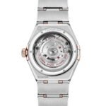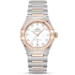 Embellished in scintillating diamonds, this stunning Constellation watch from Omega is tailored to suit the needs and desires of those ladies with a preference for the finer things in life. The luxury women’s watch is crafted from stainless steel and 18ct Sedna gold. The rose gold tones of this material are used in the diamond-set bezel, together with the famous claws, the crown and the bezel. The Omega Constellation watch Features a mother of pearl dial with diamond dot hour markers, Sedna gold hands with a luminous coating, and a date aperture at 6 o’clock. The Omega Constellation watch measures 29mm and has been integrated with 50-meter water resistance. It is powered by the Co-Axial Master Chronometer Calibre 8700, which produces a 50-hour power reserve. The movement puts its rhodium-plated finishes and Geneva waves in arabesque on show through a sapphire crystal glass exhibition caseback. To complete its timeless look, the Omega Constellation watch for women wraps around the wrist with a stainless steel and 18ct Sedna gold mono-rang bracelet, securing with a folding clasp.