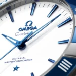 With its famous half moons on the side of the case, the Constellation watch from Omega is an elegant and enduring design. This men’s 41mm Omega Constellation watch is a steel on leather model and boasts a clean white ceramic dial. This crisp and legible display is given slender dark blue minute and hour hands, a needle fine second hand and a legible date window at 6 o’clock. Surrounding this dial, adorned with the Constellation lettering and the Omega logo, is a deep blue ceramic bezel with a Grand Feu white enamel scale featuring traditional Roman numerals. The star and faceted indexes on the dial itself are also executed in a matching deep blue colour and are protected by a piece of scratch-resistant sapphire crystal glass treated with anti-reflective treatment. This Omega Constellation watch measures a 41mm diameter and is crafted from stainless steel. Its caseback is transparent, affording a clear view of the brand’s Co-Axial Master Chronometer Calibre 8900 inside, capable of a 60-hour power reserve. In addition to this, the men’s 41mm Omega Constellation watch is fitted on a classic-looking deep blue leather strap with a rubber lining for ultimate comfort on the wrist.