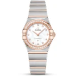 OMEGA Constellation 25mm Steel & 18ct Sedna Gold Diamond Set Ladies Watch13125256055001. Stainless steel & 18ct Sedna Gold 25mm case and diamond set bezel all on a matching two-tone steel & 18ct Sedna Gold bracelet. This ladies watch has a white mother of pearl dial with 12 diamond set hour markers. Water resistant up to 30m and sapphire crystal glass. Quartz movement.