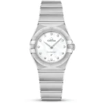 Sporting the famous mono-rang bracelet and the instantly recognisable “Griffes” or claws on the bezel, the Omega Constellation watch is synonymous with enduring style. This model for ladies measures a case size of 25mm and has been crafted from robust stainless steel. The design constitutes the perfect lady’s dress watch for adding to a touch of finesses to the every day. The timepiece is powered by a reliable Swiss-made quartz movement that sits behind a sealed caseback engraved with the Constellation Observatory medallion. It also Features a stunning mother of pearl dial adorned with meticulously set round brilliant-cut diamonds at each hour marker. The 18ct white gold hands have been carved into an elegant dauphine shape. To protect the surface of the dial and rid the wearer of any undesirable glare, the Omega Constellation Quartz watch for women is topped with a pane of sapphire crystal glass integrated with anti reflective properties. The Omega Constellation watch Features Roman numeral engraved to the surface of its bezel and secures to the wrist with a folding clasp engraved with the brand’s logo.