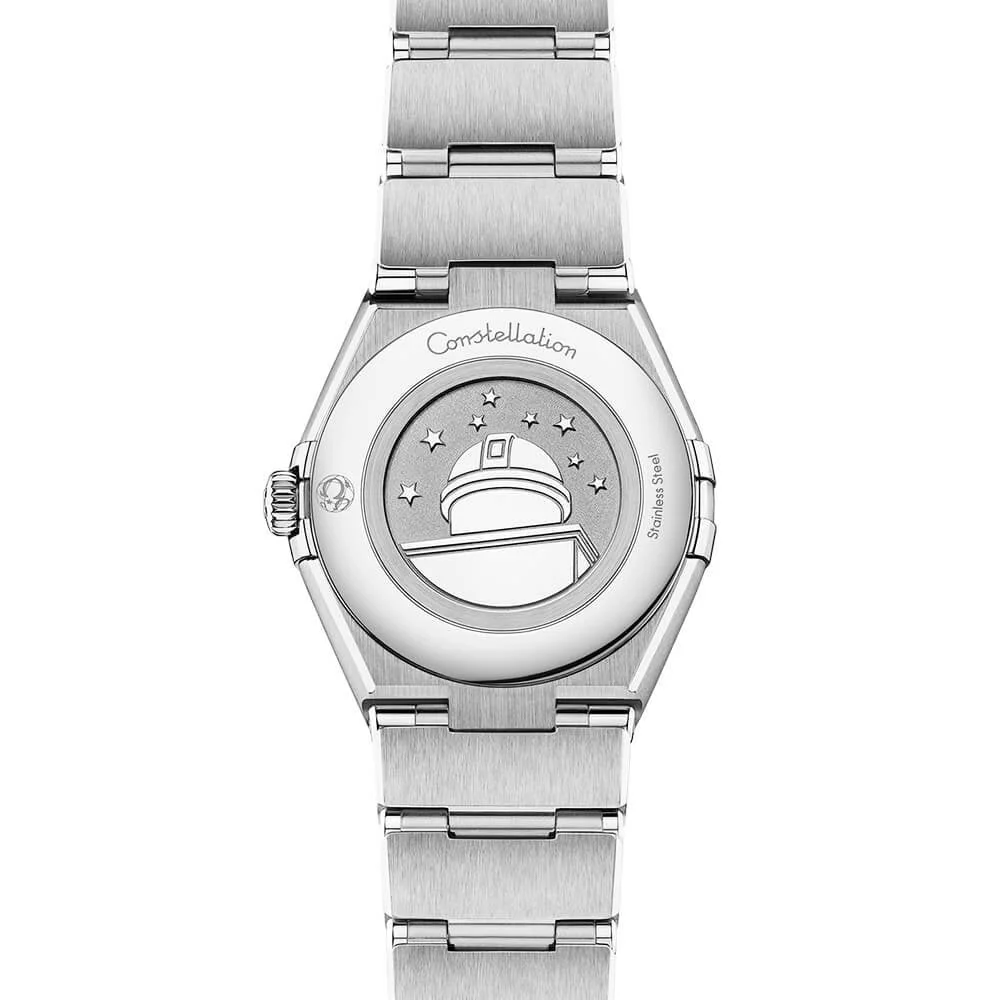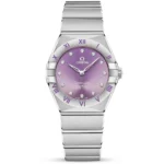 OMEGA Constellation Manhattan 28mm Purple Diamond Dial Ladies Bracelet Watch 131.10.28.60.60.002. Stainless steel 28mm case and bezel with purple roman hour numerals all on a matching stainless steel bracelet. This ladies watch has a patchouli blossom sunray dial with polished hands and 12 diamond set hour indexes. Sapphire crystal glass and water resistant up to 30m. Quartz movement.