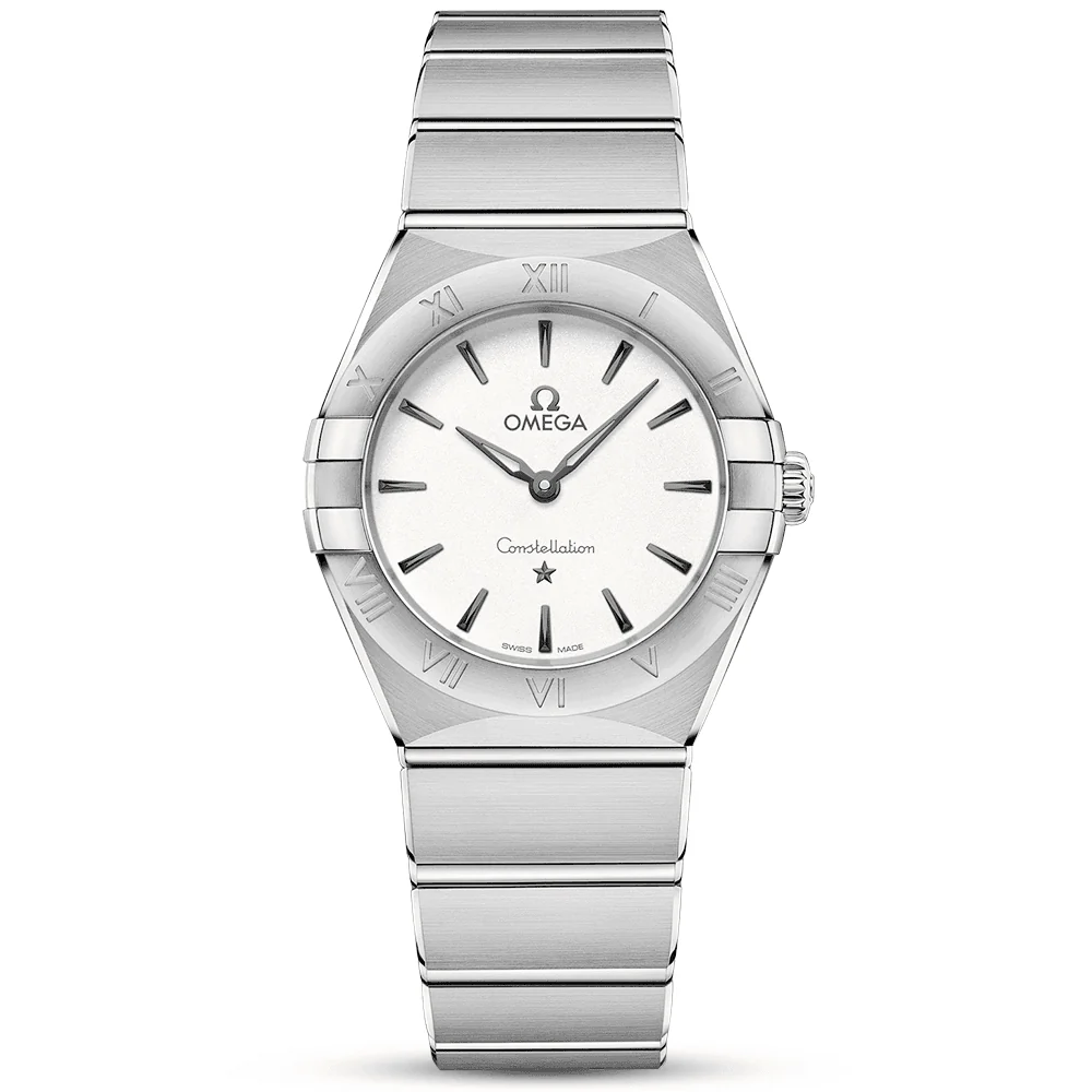 The silver dial of this lady’s Omega watch from the brand’s Constellation collection is accompanied by meticulously carved blackened hands that add a contrasting finish to the display. Joining these hands are blackened indexes, the famous Constellation star motif and Omega logo. All elements on the dial are protected by the 28mm watch’s sapphire crystal glass front, which rids the display of any undesirable glare thanks to anti reflective treatment added to both sides of the glass. This lady’s Omega Constellation Quartz watch is crafted from robust stainless steel and integrated with 30-meter water resistance. Its distinct bezel Features the instantly recognisable polished claws at either side and a set of engraved Roman numerals. Behind a sealed caseback stamped with the Constellation Observatory Medallion is a reliable quartz movement. The lady’s Omega watch completes its elegant and timeless look with a stainless steel mono-rang bracelet and a folding clasp engraved with the Omega logo.