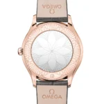 Beautiful flowing lines and contemporary curves epitomize quintessential Swiss elegance in this striking Omega De Ville Tresor watch. The timeless wristwatch for women boasts a confident 36mm case crafted from 18ct Sedna gold. This proprietary alloy is named after Sedna, an orbiting planet that exudes the most intense red colour of all within the solar system. This beautiful lady’s Omega De Ville Tresor watch is powered by a remarkably precise Swiss-made quartz movement, which performs whilst secured inside a 30-meter water resistant housing. The front of the case is topped with an anti reflective and scratch resistant sapphire crystal glass lens, protecting a lacquered opaline silver dial that includes embossed 18K Sedna gold Roman numerals and hands. The crown is polished with red “HyCeram” and set with a single scintillating diamond. This precious stone matches the round brilliant cut diamonds meticulously set along the surface of the watch’s bezel. These flow into the lugs attached to a classic-looking grey leather strap securing with an 18ct Sedna gold fastening.