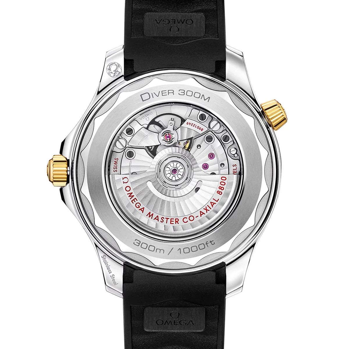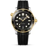 OMEGA Seamaster Diver 300m 42mm Black Dial & 18ct Yellow Gold Men’s Watch 21022422001001. Stainless steel & 18ct yellow gold 42mm case and black ceramic bezel all on a black rubber strap. This men’s watch has a black laser-engraved dial with luminous applied hands and hour markers, date display at the 6 o’clock position. Water resistant up to 300m and sapphire crystal glass. Automatic movement.
