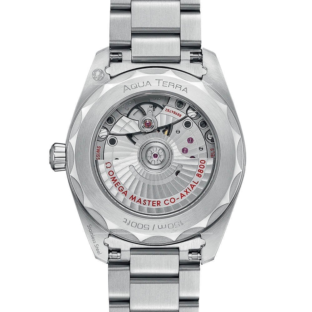 The surface of the blue dial is adorned with a horizontal “teak” pattern, creating the perfect backdrop for a useful date window at 6 o’clock. This men’s Omega Seamaster Aqua Terra watch is powered by the Master Chronometer calibre 8800, which Features a silicon balance spring and rhodium-plated finishes that are put on display through a sapphire crystal glass caseback.