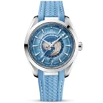 OMEGA Seamaster Aqua Terra GMT Worldtimer 41mm Summer Blue Dial Strap Watch 220.12.43.22.03.002. Stainless steel 43mm case and bezel all on a blue rubber strap. This men’s watch has a PVD-treated summer blue gradient dial with polished & luminous applied hands and hour markers as well as a date display at the 6 o’clock position & GMT function set around the dial. Water resistant up to 150m and sapphire crystal glass. 60 hour power reserve. OMEGA Calibre 8938 METAS approved automatic movement.