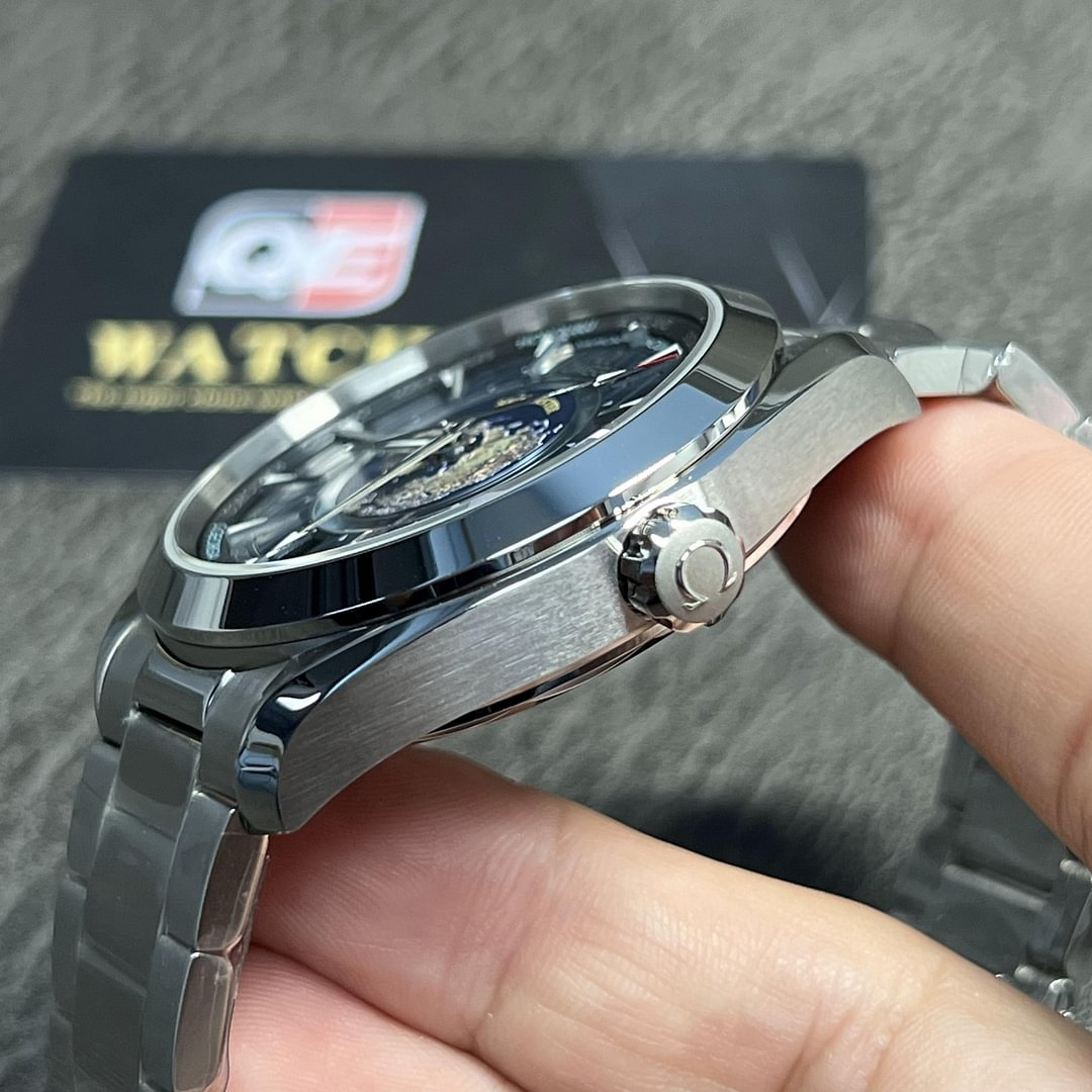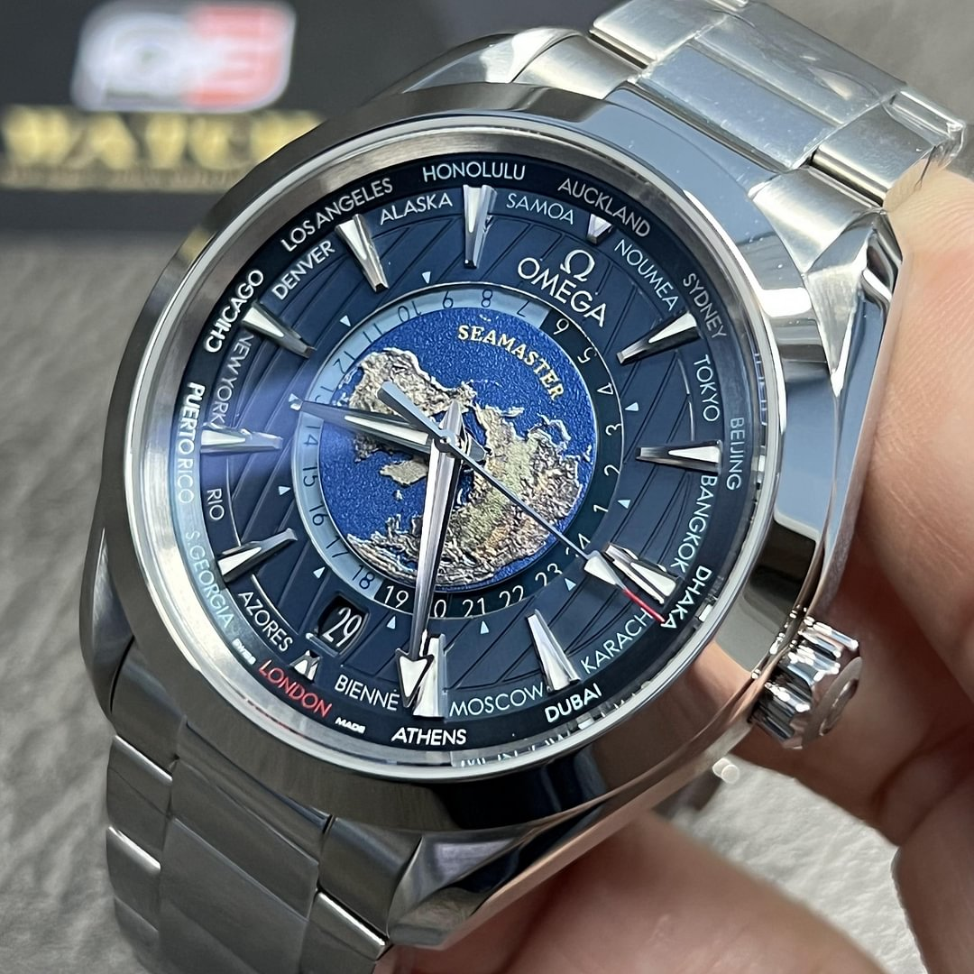 OmegaSeamaster Aqua Terra GMT Worldtimer Steel 43mm Bracelet Watch220.10.43.22.03.001. Stainless steel 43mm case and bezel all on a matching stainless steel bracelet. This men’s watch has a sun-brushed blue outer dial and a circle of global destinationsin red (GMT), silvery (+1h in summer) and blue (places without daylight savings) as well as a date display at the 6 o’clock position. The centre of the dial contains a 24-hour glass ring, with light blue to indicate daytime and dark blue to indicate night. Water resistant up to 150m and sapphire crystal glass. Master chronometer calibre 8938 automatic movement.