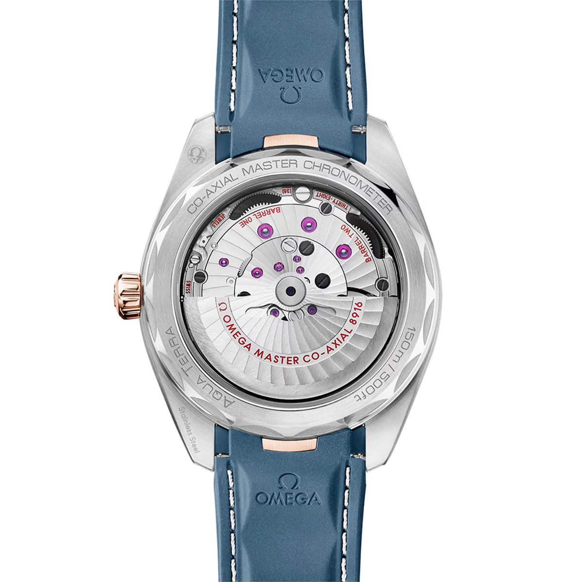 OMEGA Seamaster Aqua Terra 41mm Small Seconds Two-Tone Blue/Grey Dial Watch 22022412103001. Stainless steel & 18ct Sedna Gold 41mm case and bezel all on ablue/greyrubber strap. This men’s watch has ablue/greydial with golden & luminous applied hands and hour markers as well as a date/small seconds display at the 6 o’clock position. Water resistant up to 150m and sapphire crystal glass. 60 hour power reserve. OMEGA Calibre 8916 METAS approved automatic movement.