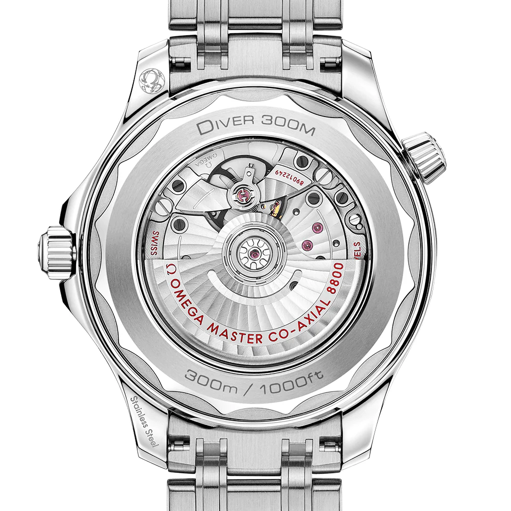Distinguishable for its legible dial and robust diver’s bezel, the Omega Seamaster Diver 300M watch collection has been enjoying a loyal following since it first launched in 1993. Ready or action and integrated with a 300-meter water resistance inside its rugged stainless steel case, the Seamaster Diver 300M watch is primed for action and Features a compact 42mm case size. The top of the watch is topped with a blue coloured ceramic unidirectional bezel for effortless measuring of elapsed time underwater. The white enamel diving scale is matched in superior visibility with a set of Super-LumiNova filled hands and indexes against a sun-brushed chrome-coloured ceramic dial with laser-engraved waves. Omega has placed a useful date window at 6 o’clock on this specially engraved dial, while a domed anti reflective sapphire crystal glass front protects it from external damage. The same strong glass is used on the back of the case, exposing the performance of the Omega Master Chronometer Calibre 8800 through its clear lens. This self-winding movement, complete with Geneva waves and rhodium-plated finishes, is also protected from magnetic fields up to 15,000 gauss and promises a 55-hour power reserve. This men’s Omega Seamaster Diver 300M watch Features a helium escape valve at 10 o’clock, a screwed-down crown and wraps comfortably around the wrist with a stainless steel bracelet with a folding clasp.