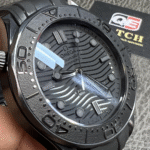This striking 43.50mm model is crafted with black ceramic [ZrO2], creating a distinctive and uniform look. The case, bezel, wave-pattern dial, crown, and helium escape valve all share the same exquisite material. To maintain visibility without compromising the aesthetic, anthracite Super-LumiNova has been applied to the diving scale, black PVD indexes, skeleton hands, and the dot at 12 o’clock.