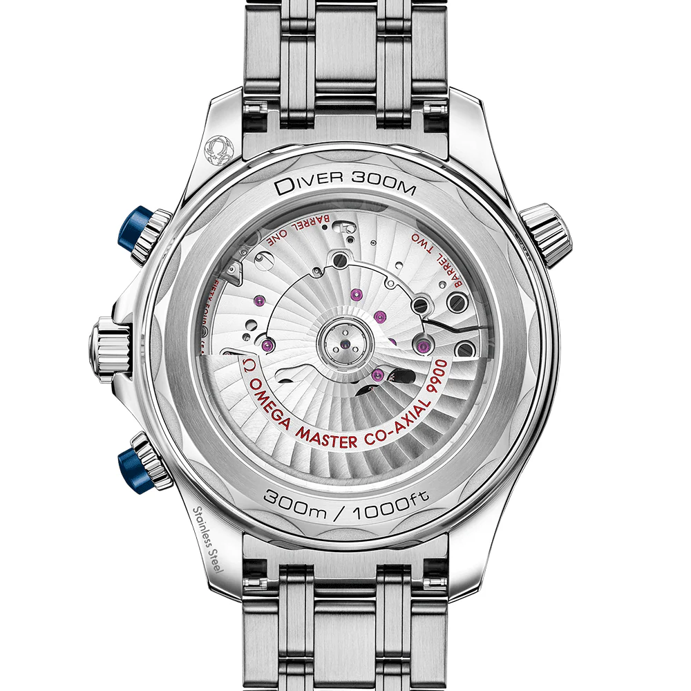 Having enjoyed a legendary following since 1993, the Seamaster Diver 300M watch series from Omega continues forward with more robust, reliable dive tools. This 44mm stainless steel model Features a polished blue ceramic dial with a polished and brushed laser-ablated wave effect pattern. The chunky hands and the legible hour markers are rhodium plated and have been filled with Super-LumiNova materials whilst atop of the dial, a strong domed sapphire crystal glass protects the display’s special surface from denting, scratching, light, heat and moisture damage. This men’s Omega Seamaster Diver 300M watch is powered by the Master Chronometer Calibre 9900, which can be seen through the sapphire crystal pane set into the wave edged caseback. The movement is capable of producing 60 hours of power reserve and is resistant to magnetic fields up to 15,000 gauss. To uphold the 300-meter water resistance of this Omega Seamaster watch, the case is equipped with a helium escape valve and Features a screw-down case. A blue ceramic bezel with a white enamel diving scale matches the blue-coated push-pieces at 2 and 4 o’clock, and the Omega Seamaster Diver 300M watch also comes with a brushed and polished stainless steel bracelet with folding clasp.