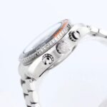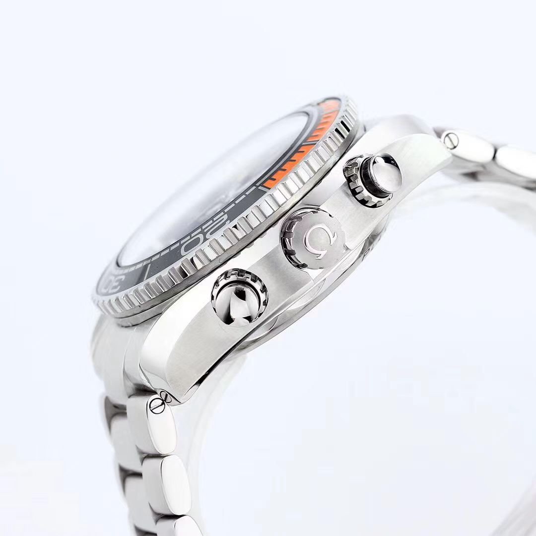 Stainless steel & black/orange ceramic 45.5mm case and bezel all on a stainless steel bracelet. This men’s watch has a black dial with polished and luminous applied hands and hour markers, date display at the 6 o’clock position. Water resistant up to 600m and sapphire crystal glass. Power reserve up to 60 hours. OMEGA calibre 9900 automatic chronograph movement.