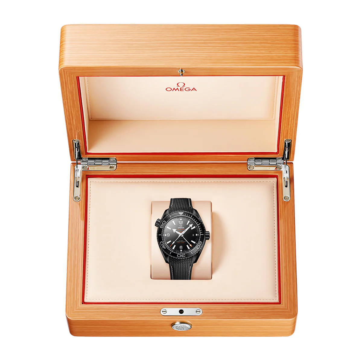 OMEGA Seamaster Planet Ocean 600m Deep Black 45.5mm Men’s Watch 21592462201001.Black ceramic 45.5mm case and bezel all on a black rubber strap. This men’s watch has a black dial with polished hands and hour markers, date display at the 3 o’clock position. Sapphire crystal glass and water resistant up to 600m. 60 hours power reserve. Automatic movement.