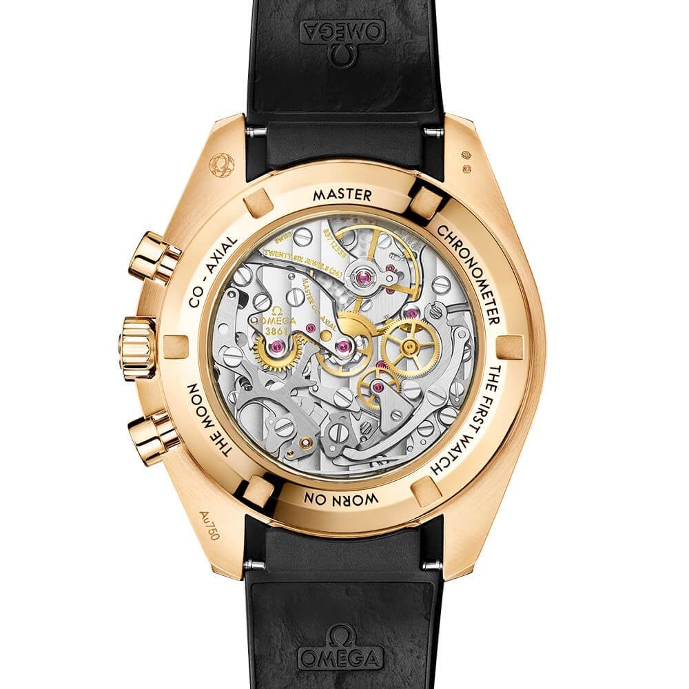 This OMEGA Speedmaster Moonwatch measures a diameter of 42mm and is integrated with 50-meter water resistance. It also holds the brand’s Co-Axial Master Chronometer Calibre 3861 at its centre, held behind a polished 18K Moonshine Gold caseback with double bevels and the “FIRST WATCH WORN ON THE MOON” engraved lettering in black.