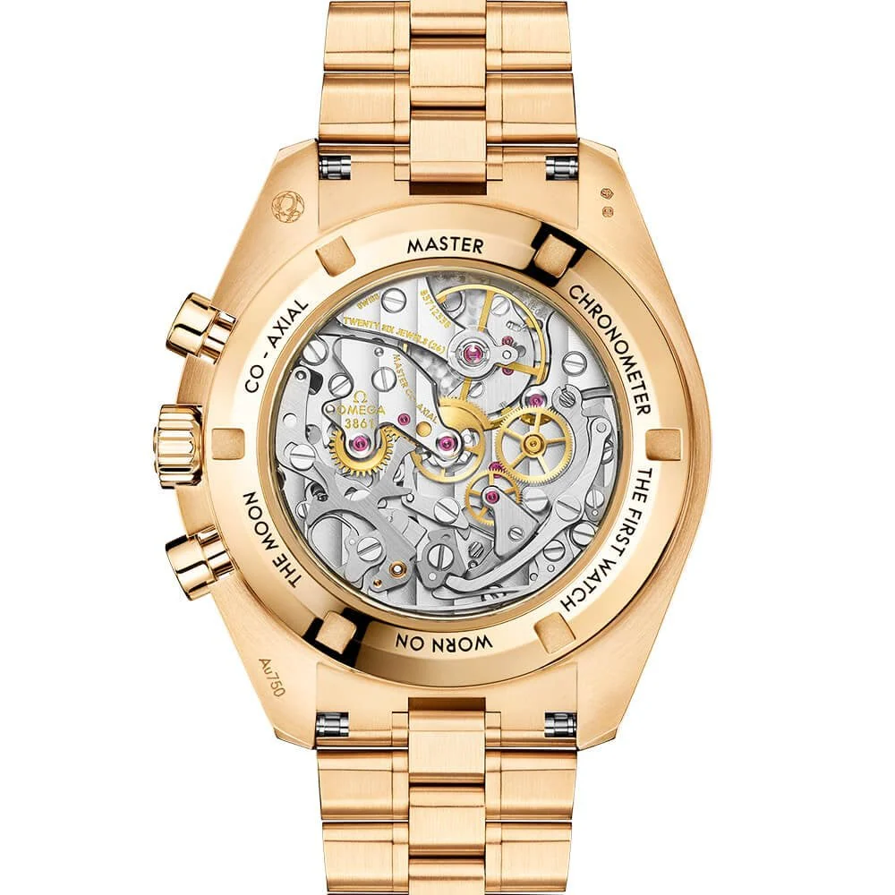 Inspired by the fourth generation of the Omega Speedmaster, this elegant and luxurious Omega Speedmaster Moonwatch is crafted from the brand’s patented Moonshine Gold material, inspired by the shining moon against a rich blue night sky. The model measures a 42mm diameter and displays the time via a sun-brushed green PVD “step” dial with luminous hour markers and hands. It also Features a trio of chronograph counters displayed in the iconic 3-6-9 layout, offering a 30-minute, 12-hour and small seconds function respectively. These dial elements are protected by a strong piece of sapphire crystal glass front whilst the back of the case Features a polished 18K Moonshine Gold surface engraved with the “FIRST WATCH WORN ON THE MOON” lettering in black. The Omega Co-Axial Master Chronometer Calibre 3861 sits behind this, complete with a luxury finish and providing a 50-hour power reserve. Alongside its chronograph functions, the watch is also fitted with a deep green ceramic bezel with a tachymetric scale in Ceragold for measuring speed based on distance. The men’s Omega Speedmaster Moonwatch also Features an 18K Moonshine Gold bracelet with an engraved Omega folding clasp.