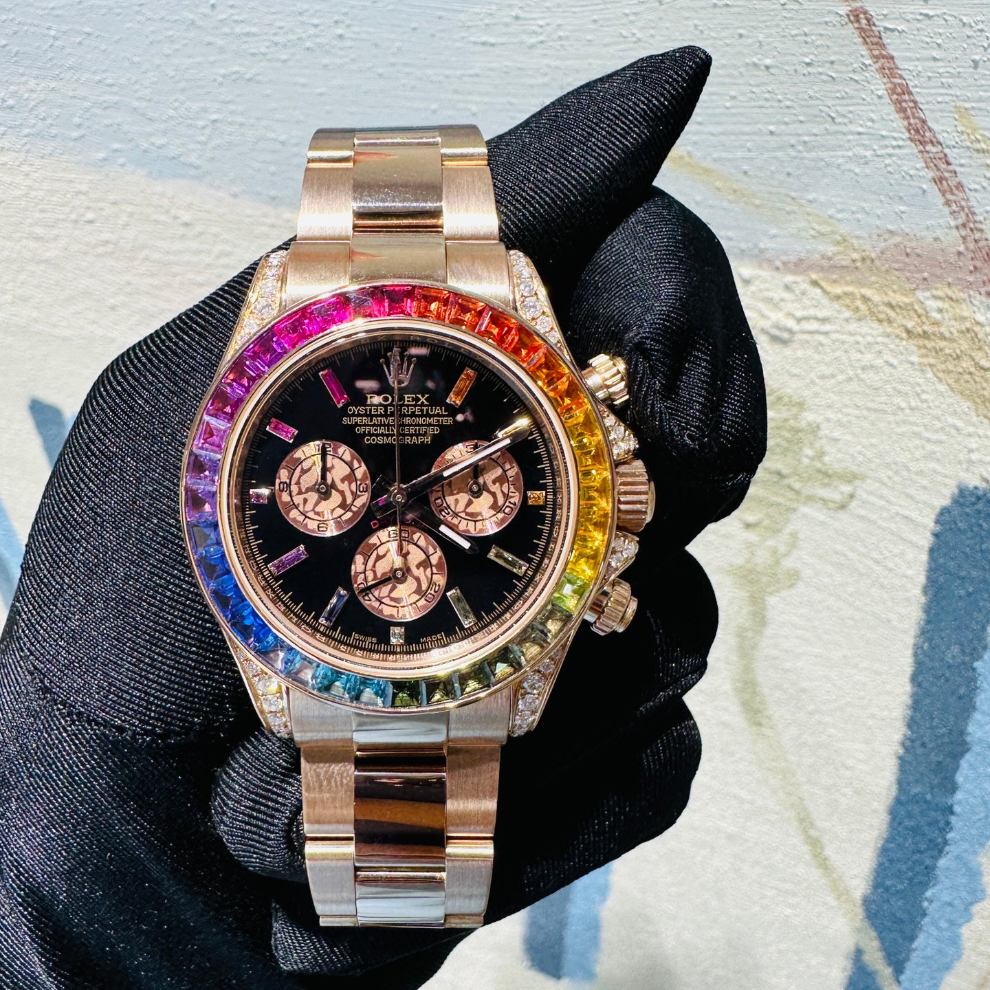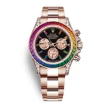 With the street cred of a Rapper’s bling, the Rolex Daytona ‘Rainbow’ is quite possibly the most in demand precious metal Daytona in production today.