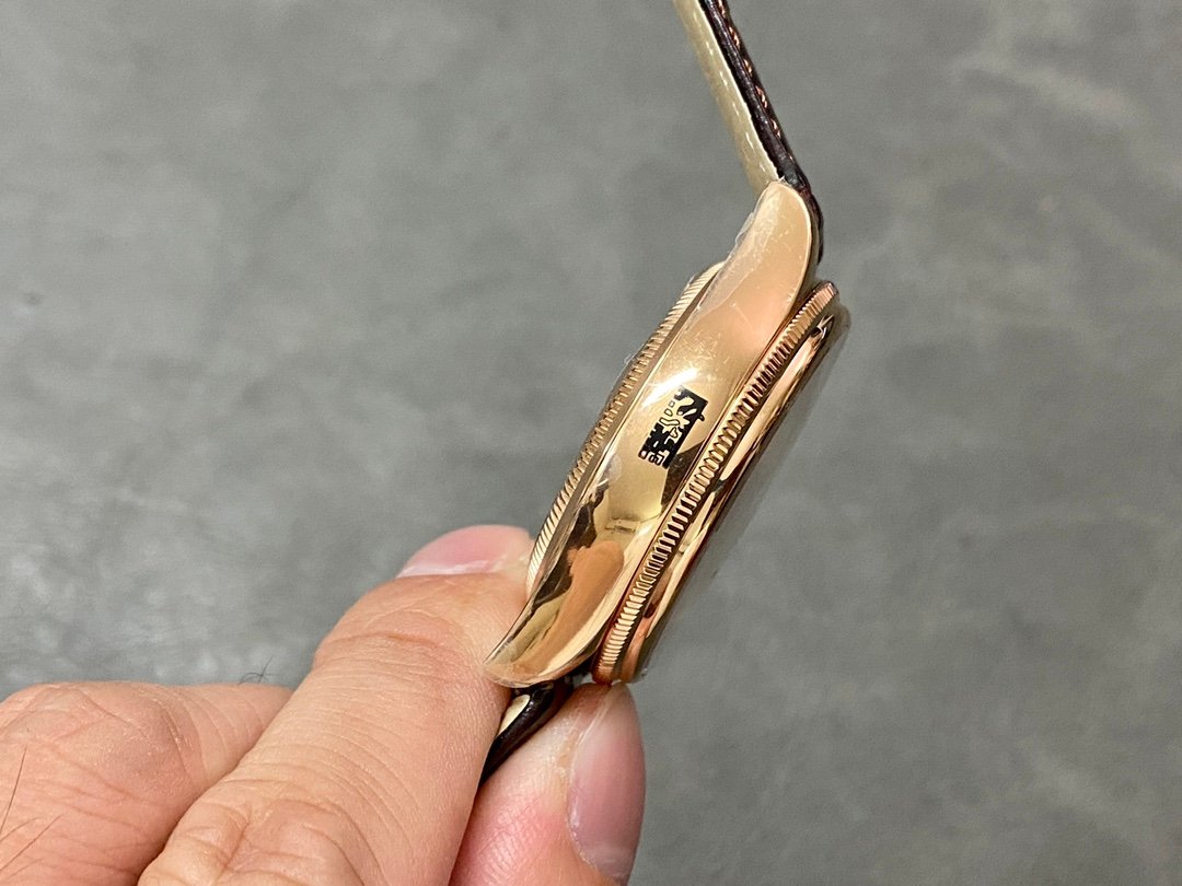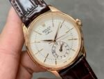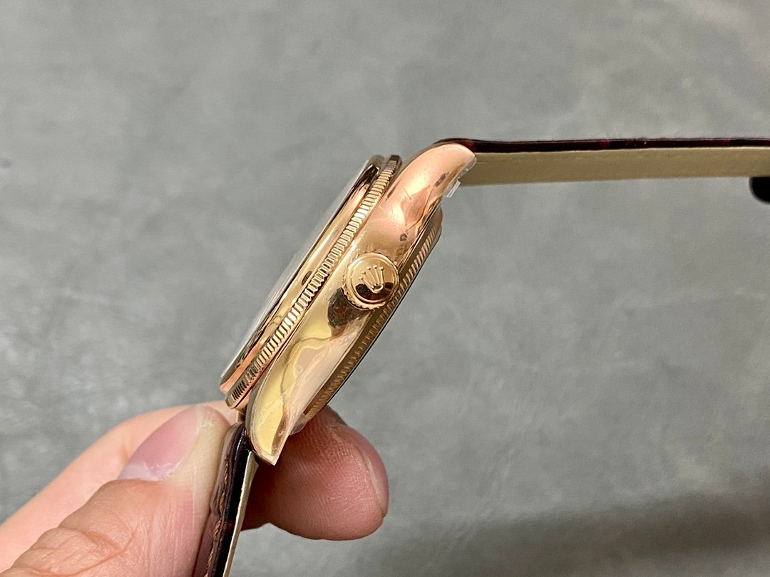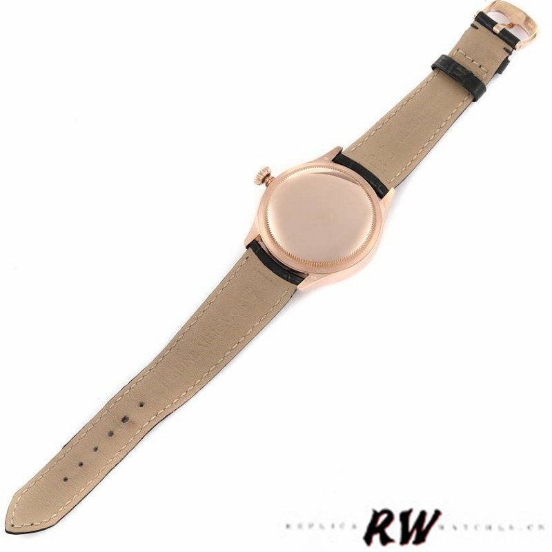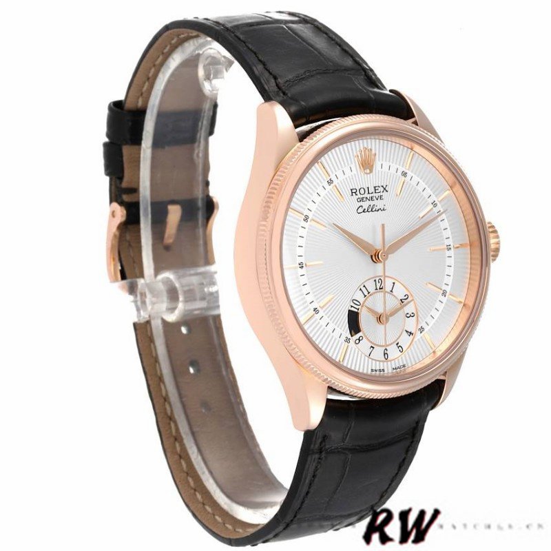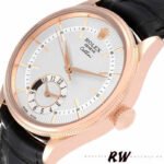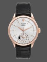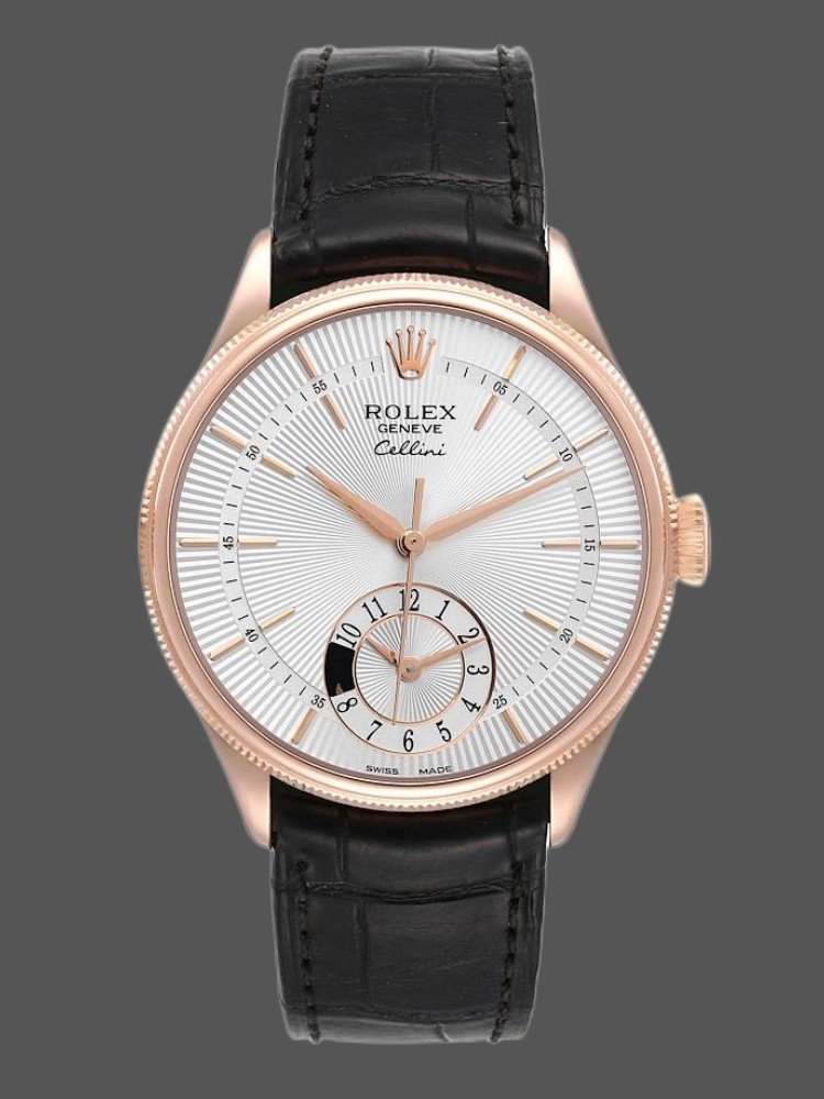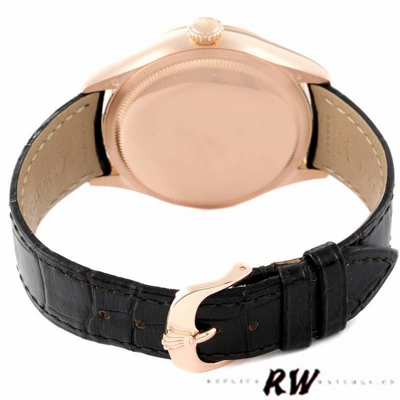 Rolex Cellini Dual Time 50525 Brown Guilloche Dial Black Leather Strap 39mm Mens Replica Watch , 39mm Everose case, flared screw-down crown, double domed and fluted bezel, domed sapphire crystal, brown guilloche dial, Everose gold index hour markers, Second time zone at 6 o’clock with day/night indicator, Shiny black alligator leather strap with Everose gold buckle.