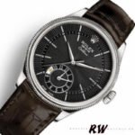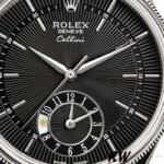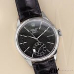 Rolex Cellini Dual Time 50529 Black Dial Brown Leather Strap 39mm Mens Replica Watch,39mm white gold case, domed and fluted double bezel, screw down winding crown, domed sapphire crystal, Black guilloche dial with white gold hour markers and hands, Sub-dial at 6 o’clock displaying second time zone and day-night indicator, Shiny brown alligator leather strap with white gold buckle.