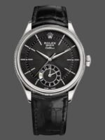 Rolex Cellini Dual Time 50529 Black Guilloche Dial 39mm Mens Replica Watch has a White Gold 39 mm Round Case with Screw Down Crown and a White Gold Bezel.Black guilloche dial and stick hour markers, Second time zone function at 6 o’clock, on a black alligator strap with white gold tang buckle will look great on your wrist.