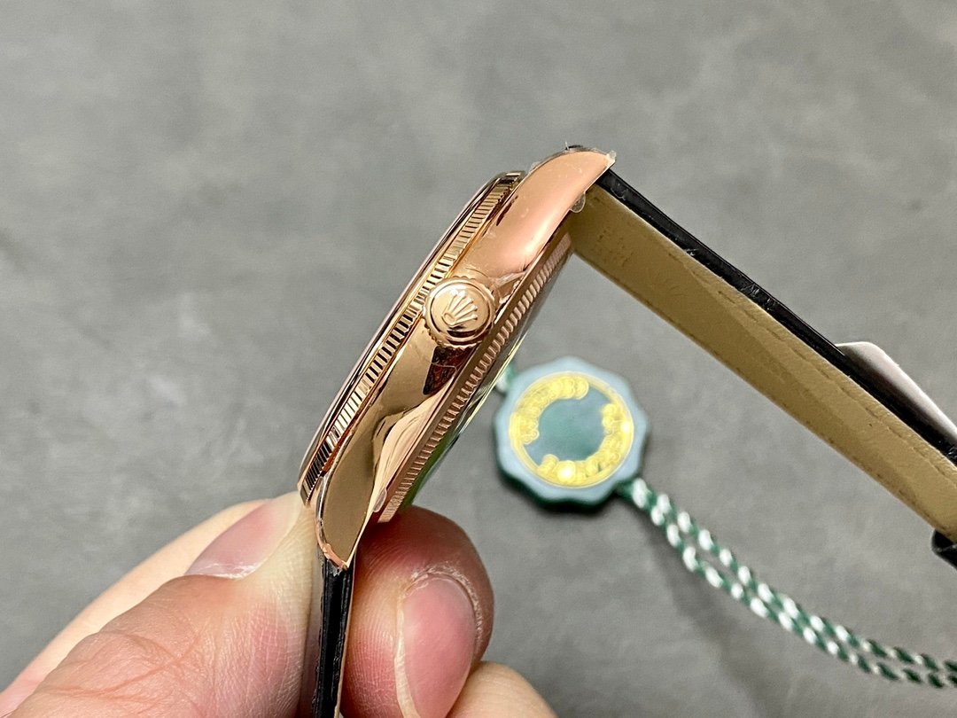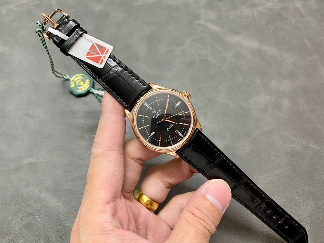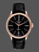 Rolex Cellini Time 50505 Black Leather Strap Black Dial 39mm Mens Replica Watch,39mm rose gold round case in diameter.Polished solid everose gold domed and fluted fixed double bezel.Scratch resistant sapphire crystal. Black dial with raised polished rose gold baton hour markers. Fine printed minute/seconds track. Centre hour, minute and seconds rose gold hands. Custom black leather strap with rose gold tang buckle.
