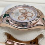 Rolex Cosmograph Daytona 116505 Oyster Bracelet Rose Ivory Dial 40mm Mens Replica Watch.features a 40mm rose gold case and rose gold bezel with an engraved Tachymetric scale. The dial is a unique ivory color which features snailed counters, luminous hour markers and hands and a Chromalight display. It is housed on a rose gold bracelet with a folding-clasp.