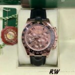 Rolex Cosmograph Daytona 116515 Chocolate Brown Dial 40mm Mens Replica Watch.40mm Everose gold case with brushed and polished finished center lugs.features chocolate dial with Arabic numerals. Black ceramic bezel. Comes on black leather strap with rose gold deployant buckle. Black “Cerachrom” bezel, made of highly durable ceramic that is extremely hard, highly scratch-resistant, has excellent corrosion resistant properties is unaffected by ultraviolet rays so the color will not fade.