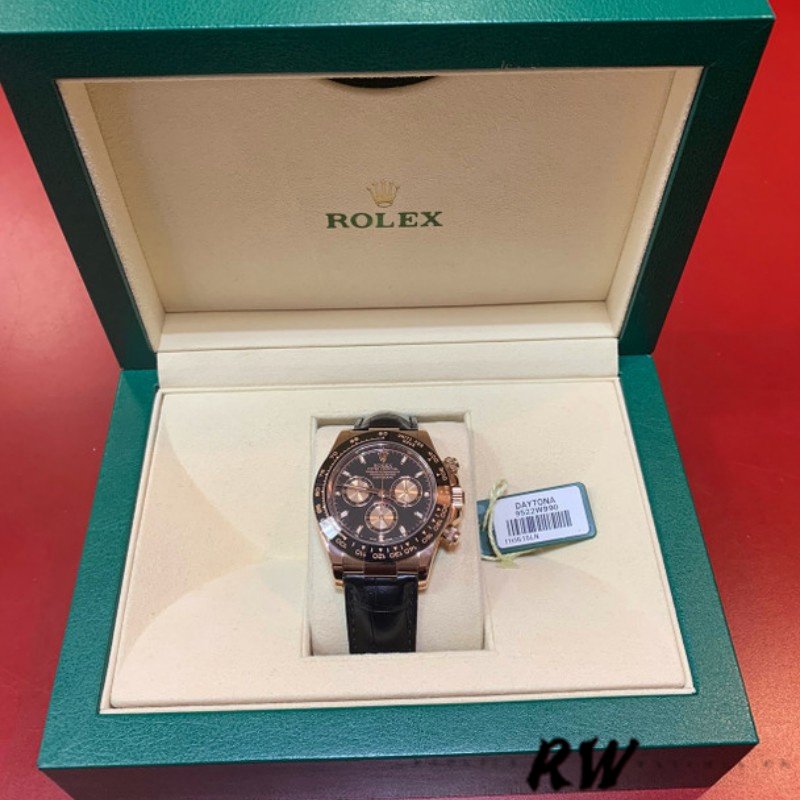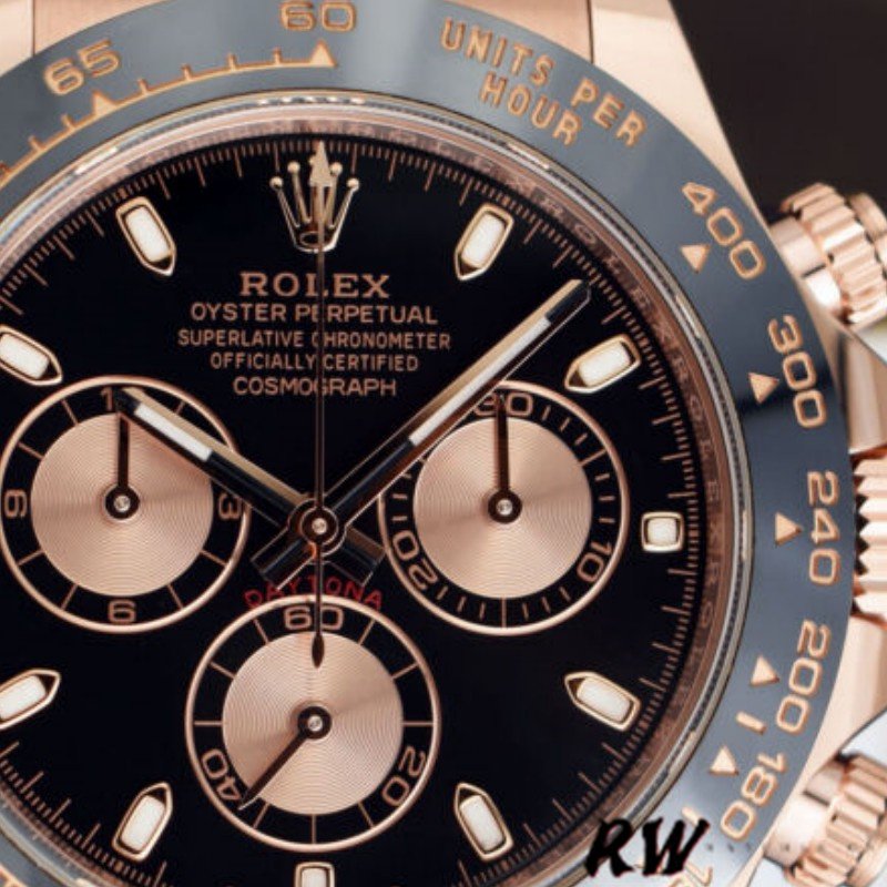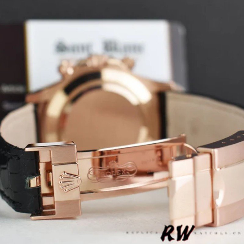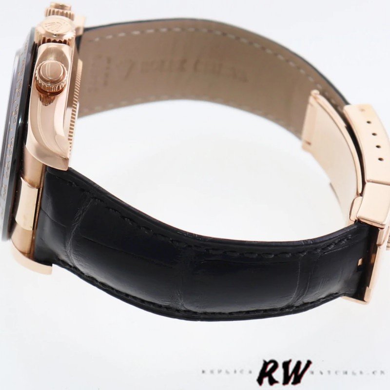 Rolex Cosmograph Daytona 116515 Leather strap Black Dial 40mm Mens Replica Watch.40mm rose gold case. Ceramic black bezel with tachymetric scale. This elegant rose gold chronograph features a black dial with contrasting typeface and ‘ringed’ guilloché sub-dials, Chromalight hands and hour markers, and a scratch-proof black Cerachrom tachymetric bezel. Black rubber Oysterflex strap with fold over clasp with safety.