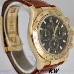 Rolex Cosmograph Daytona 116518 Brown Leather Strap 40mm Mens Replica Watch has a black profile attached to 40mm yellow gold case.Cerachrom bezel showing tachymeter markings. Black dial with luminous gold-tone hands and index hour markers. Minute markers around the outer rim. Brown Leather Strap with Pattern.Scratch Resistant Sapphire Crystal.Multiple precision functions, including center hour, small seconds and chronograph.