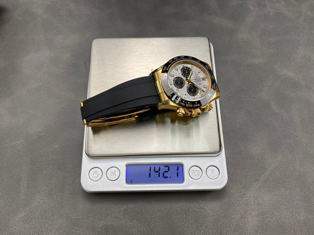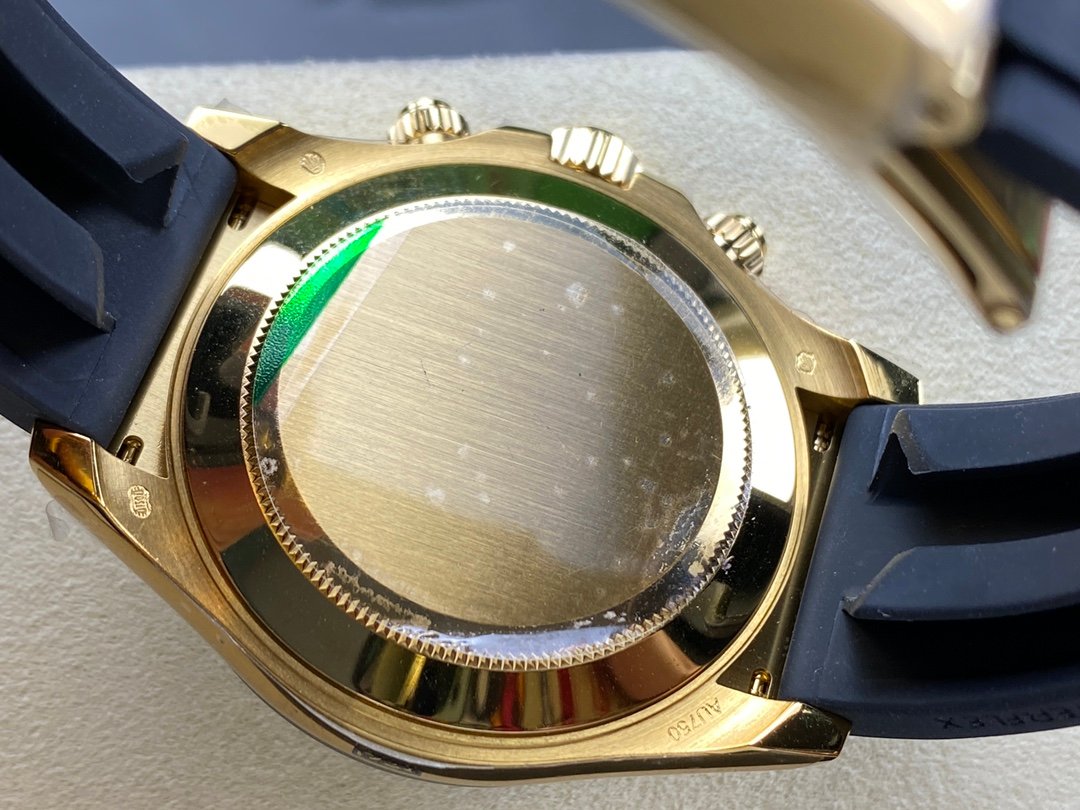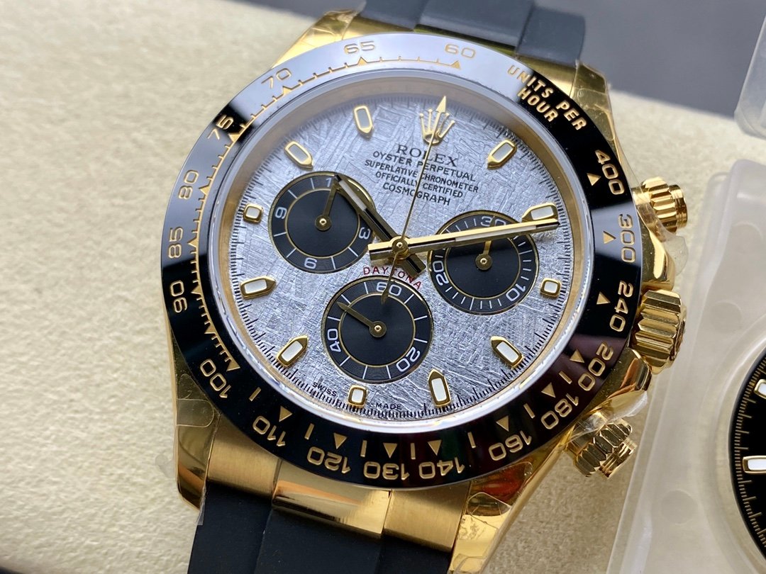 Rolex Cosmograph Daytona 116518LN Meteorite and Black Index Dial 40mm Mens Replica Watch.40mm yellow gold case, screw-down yellow gold back, screw-down crown and push buttons with Triplock triple waterproofness, black monobloc Cerachrom bezel with engraved tachymetric scale, scratch-resistant double anti-reflective sapphire crystal, meteorite dial, black subdials, index hour markers, Chronograph central second hand, 30-minute counter at 3 o’clock, and 12-hour counter at 9 o’clock, black Rubber strap made from flexible metal blades overmoulded with high-performance elastomer,Folding safety buckle with rapid extension system.