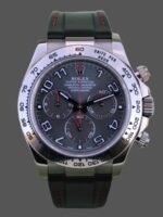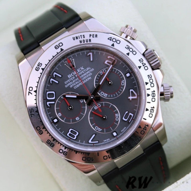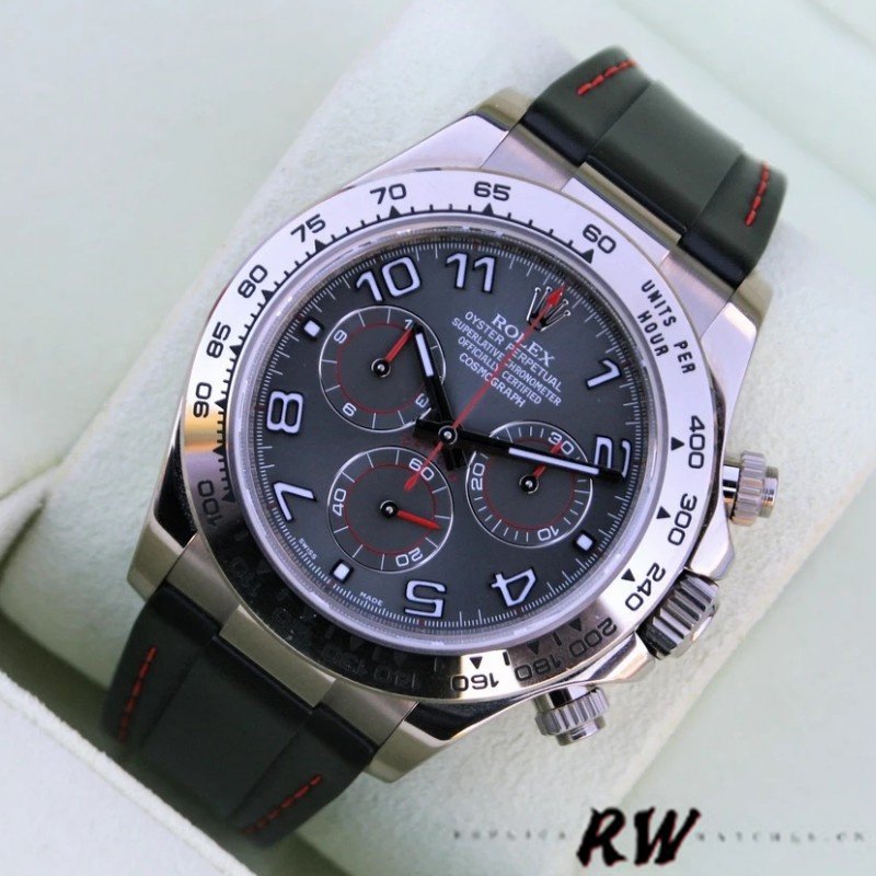 Rolex Cosmograph Daytona 116519 Grey Racing Dial 40mm Mens Replica Watch.The 40mm white gold case Rolex watch has a Triplock winding crown and two screw-down chronograph pushbuttons.Racing grey dial with triple grey counters with luminescent grey gold indexes and hands,Fixed domed tachymeter bezel and a scratch-resistant sapphire crystal.It comes with a Stunning Slate Dial with Red Hands.The watch comes with Black RubberB band with red stitching.