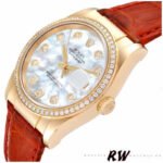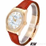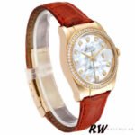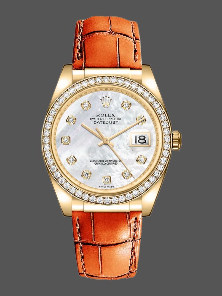 Rolex Datejust 116188 Mother of Pearl Diamond 36mm Unisex Replica Watch self – winding automatic watch, features a 36mm yellow gold case with a diamond bezel surrounding a white mother-of-pearl diamond dial on an orange alligator strap with an yellow gold deployant buckle. Functions include hours, minutes, seconds and date. Scratch resistant sapphire crystal with Cyclops magnifier. It is one of the most recognisable of watches.