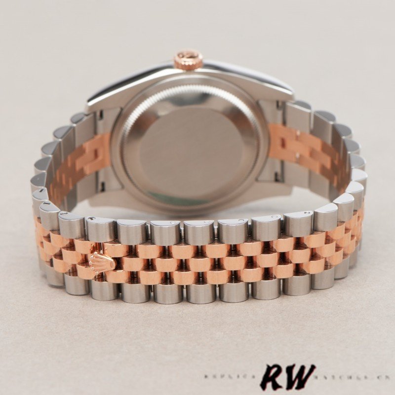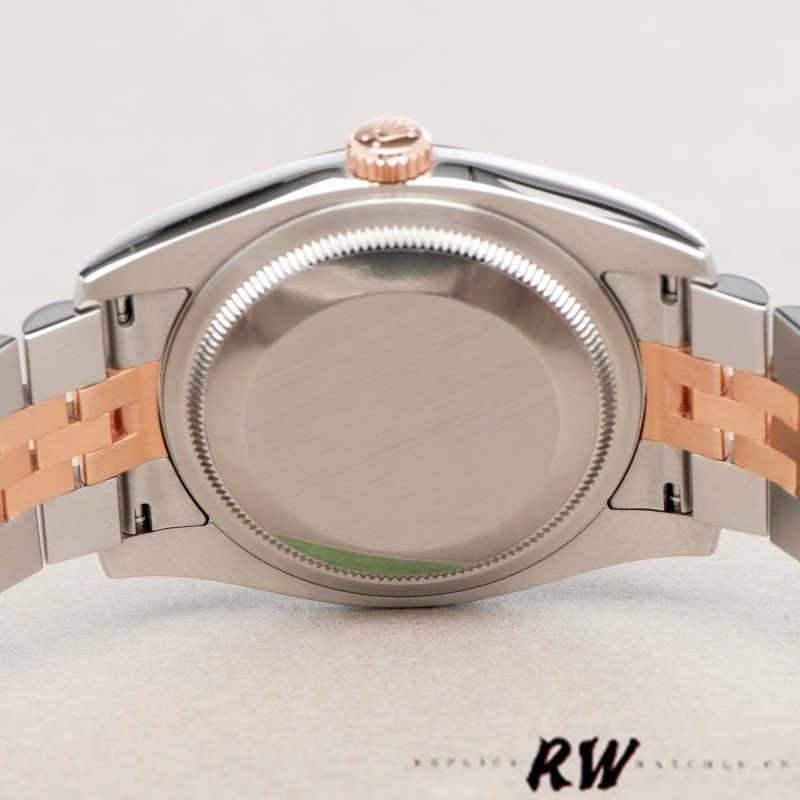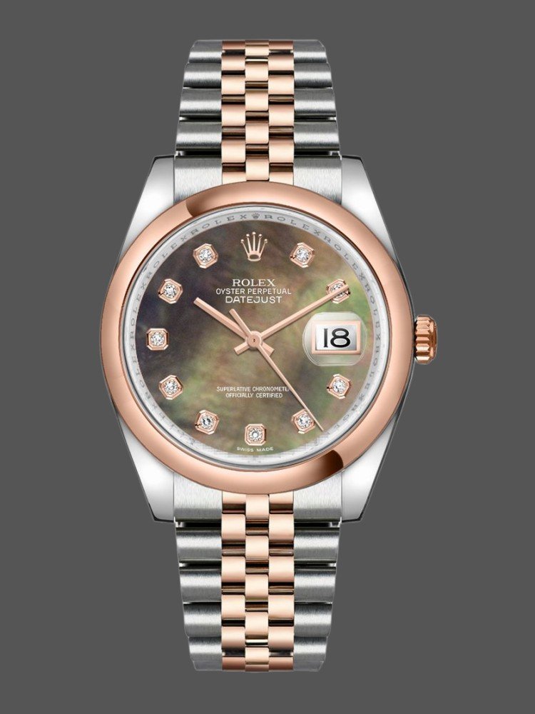 Rolex Datejust 116201 Black Mother of Pearl Dial 36mm Unisex Replica Watch.Stainless steel case with a stainless steel Rolex jubilee bracelet with everose gold center links. Fixed fluted everose gold bezel. Black mother of pearl dial with rose gold-tone hands and diamond hour markers. The beautifully streamlined oyster bracelet and jubilee bracelet that make wearing this watch a truly unique pleasure.
